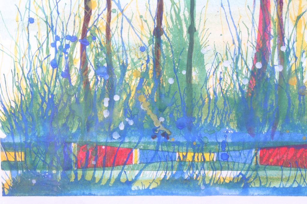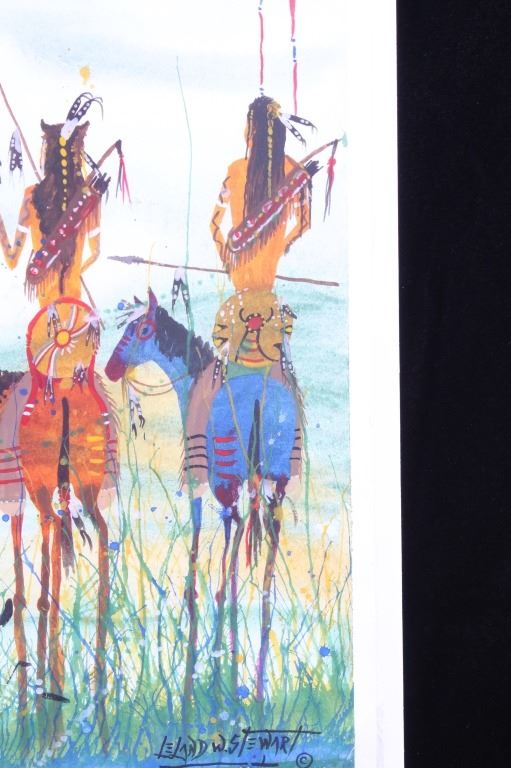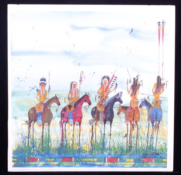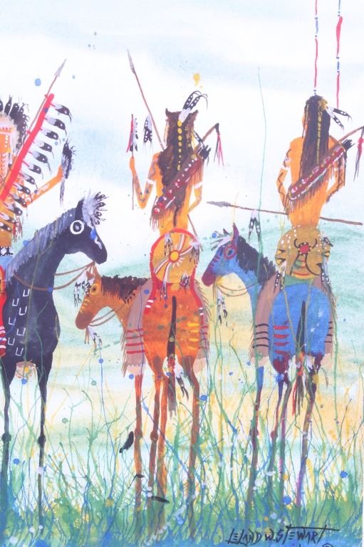Featured in this lot we have an original watercolor painting by Crow Native American Indian artist Leland Stewart in his iconic horseback warrior design. Leland Stewart, a Montana native, is a member of the Crow Nation, Whistling Water Clan and the High Hawk Society. He graduated from the Institute of the American Indian Arts in 1975. Stewart's artwork is featured in in Montana fine art galleries and beyond. This painting shows a War party of five Crow Warriors all on horseback standing on a grassy landscape. The painting also features a geometric "Blanket Strip" design across the bottom of the piece. The piece exhibits Stewart’s unique style of bright, vivid colors and personal interpretation of his Native American Indian heritage. Many of Stewart’s works can be found at the Sam Terakedis Fine Art & Jewelry Gallery. Some examples of his art have been priced at $6,200 for Two Sisters in the Bear Paws, $5,500 for Uncle Buffalo, and $6,000 for The Visitor. This example is of a large size such as the above paintings. Leland Stewart’s work has been in high demand since his work has been on permanent display at the Yellowstone Art Museum in Billings, Montana. The piece is signed in the lower right corner "Leland Stewart 2020". The art shows good condition overall with no visible wear. The art piece measures 22" wide by 22" tall.