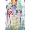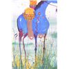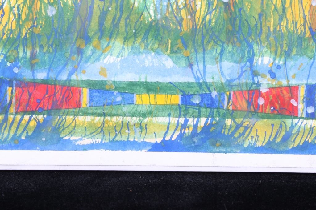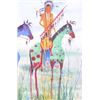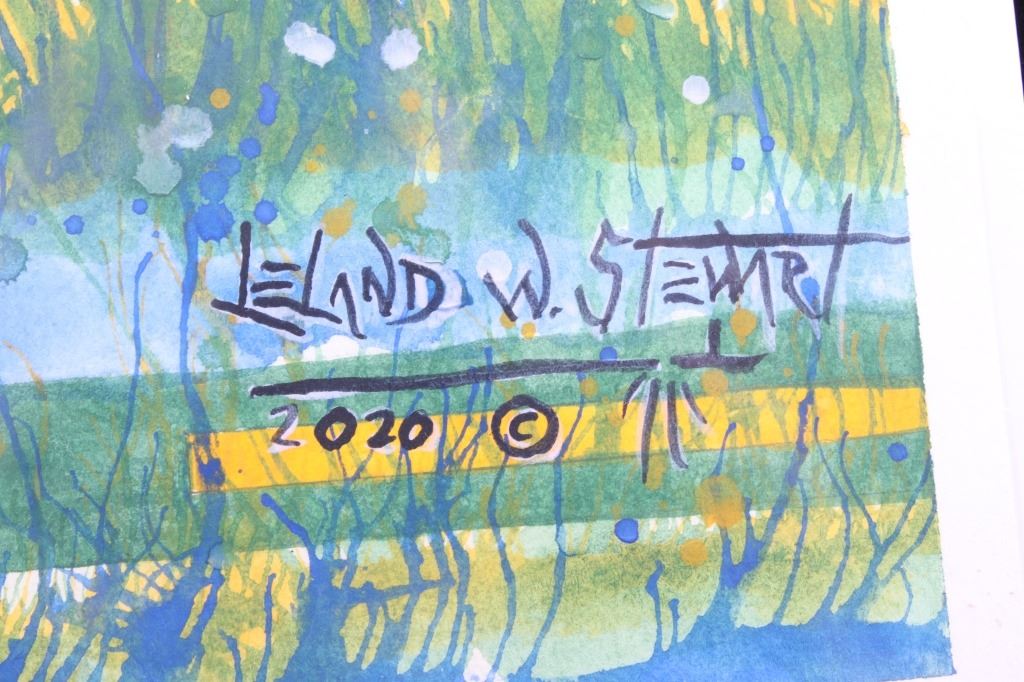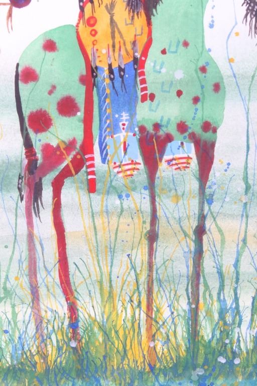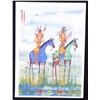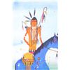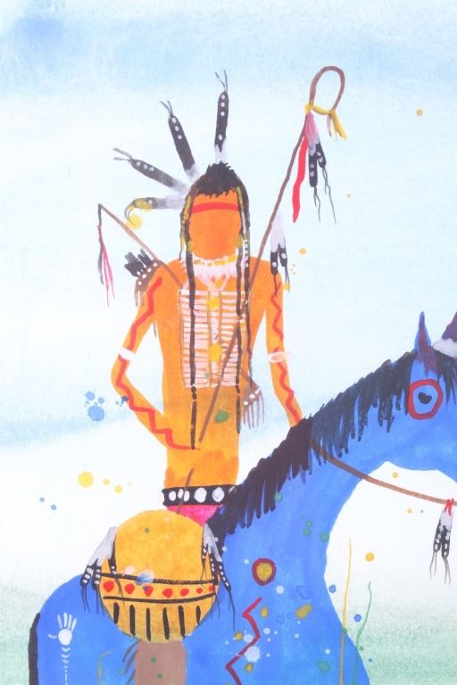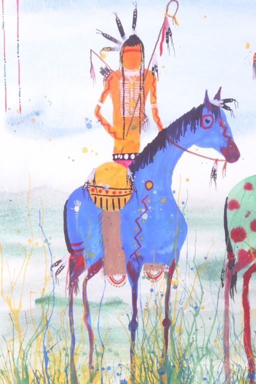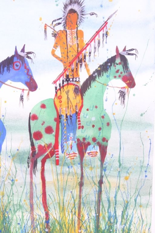 Included in this lot we have an original watercolor painting by Crow Native American Indian artist Leland Stewart in his iconic horseback warrior design. Leland Stewart, a Montana native, is a member of the Crow Nation, Whistling Water Clan and the High Hawk Society. He graduated from the Institute of the American Indian Arts in 1975. Stewart's artwork is featured in in Montana fine art galleries and beyond. This painting shows a pair of Crow Warriors on horseback with war paint on the braves and horses. The warriors are depicted holding spears with shields on the saddles and bows across the back. The painting also features a geometric "Blanket Strip" design across the bottom of the piece. The piece exhibits Stewart’s unique style of bright, vivid colors and personal interpretation of his Native American Indian heritage. Many of Stewart’s works can be found at the Sam Terakedis Fine Art & Jewelry Gallery. Some examples of his art have been priced at $6,200 for Two Sisters in the Bear Paws, $5,500 for Uncle Buffalo, and $6,000 for The Visitor. Leland Stewart’s work has been in high demand since his work has been on permanent display at the Yellowstone Art Museum in Billings, Montana. The piece is signed in the lower right corner "Leland Stewart 2020". The watercolor is in very good condition. The painting measures 16" wide by 22" tall.