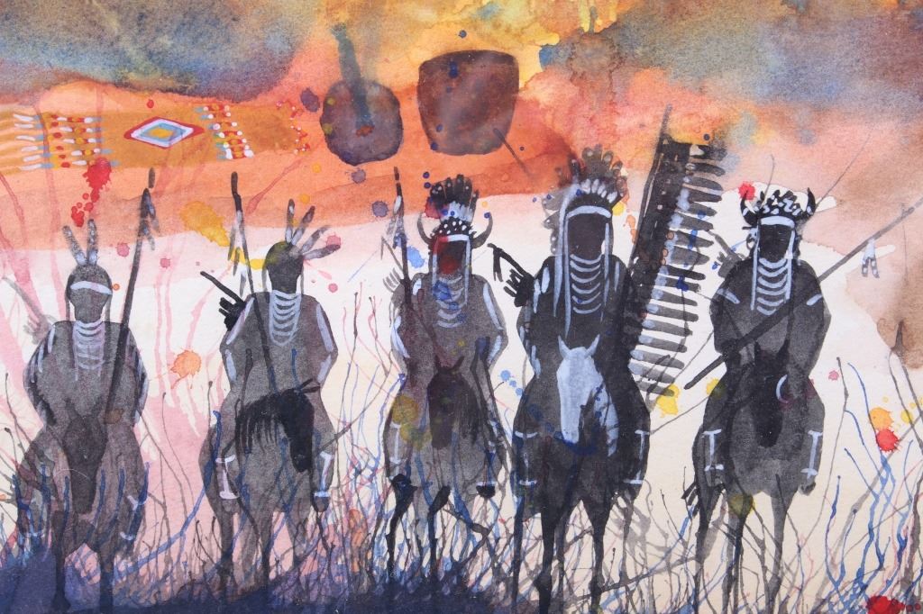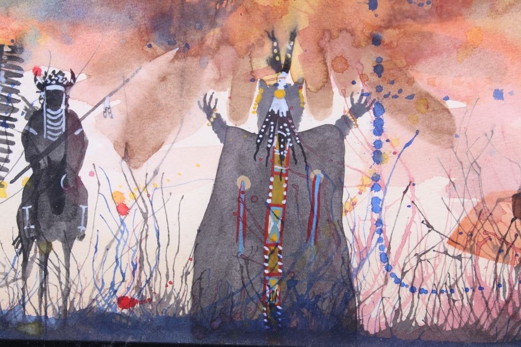 Featured in this lot we have an original watercolor painting by Crow Native American Indian artist Leland Stewart in his iconic horseback warrior design. Leland Stewart, a Montana native, is a member of the Crow Nation, Whistling Water Clan and the High Hawk Society. He graduated from the Institute of the American Indian Arts in 1975. Stewart's artwork is featured in in Montana fine art galleries and beyond. Many of Stewart’s works can be found at the Sam Terakedis Fine Art & Jewelry Gallery. Some examples of his art have been priced at $6,200 for Two Sisters in the Bear Paws, $5,500 for Uncle Buffalo, and $6,000 for The Visitor. This painting shows three robes figures with the head of a bear, elk, and buffalo. The bottom of the art displays nine Crow Native American braves with eight of the figures on horseback. The piece exhibits Stewart’s unique style of bright, vivid colors and personal interpretation of his Native American Indian heritage. This example is of a large size such as the above paintings. Leland Stewart’s work has been in high demand since his work has been on permanent display at the Yellowstone Art Museum in Billings, Montana. The piece is signed in the lower right corner "Leland Stewart 2020". The watercolor is in very good condition. The art measures 22" wide by 30" tall.