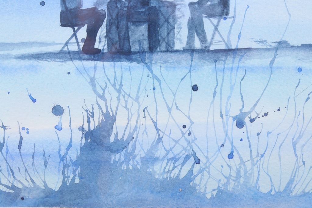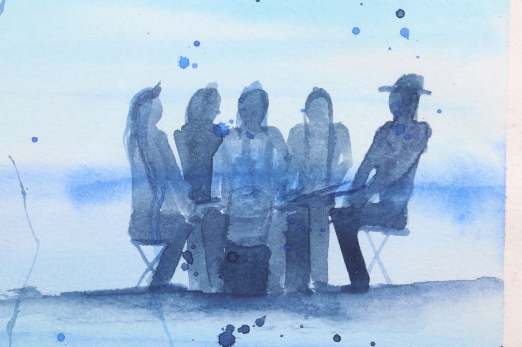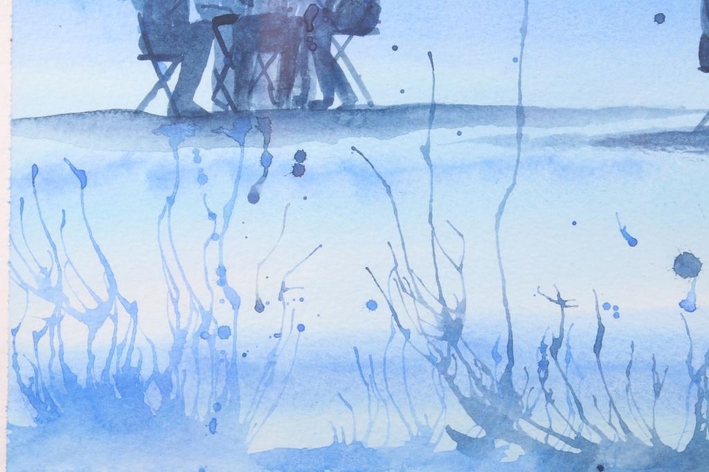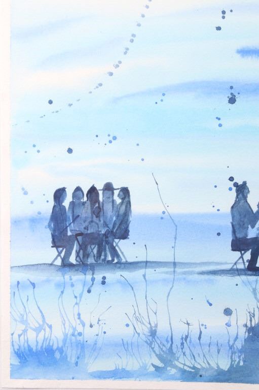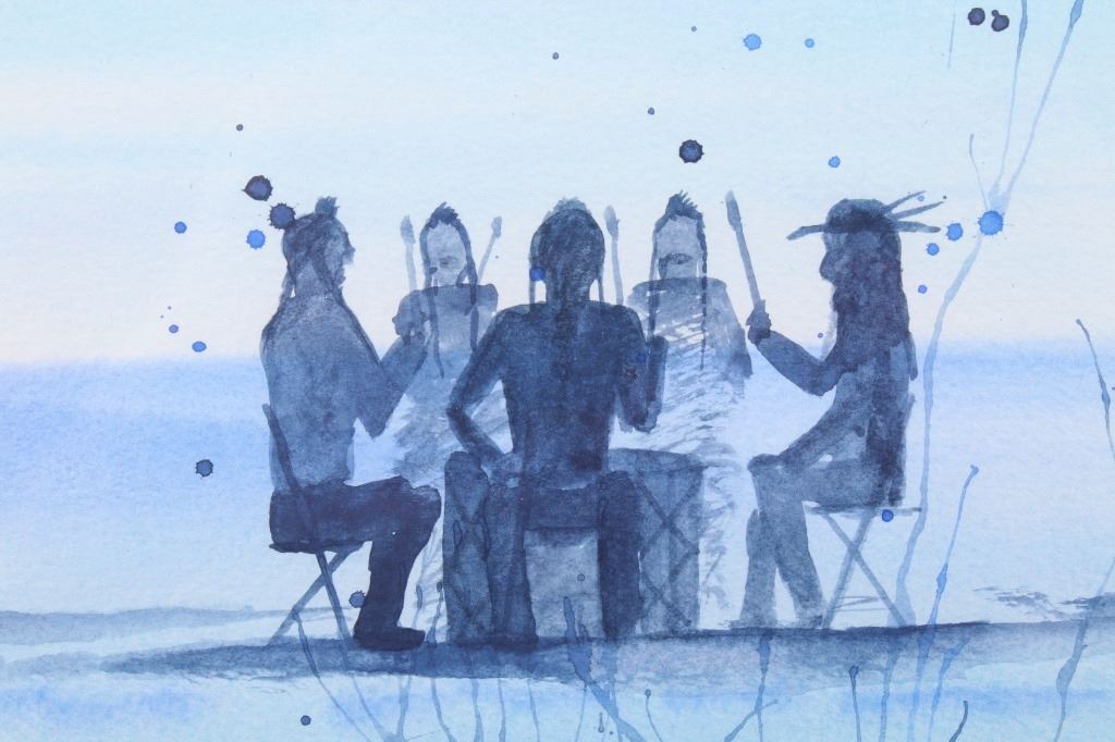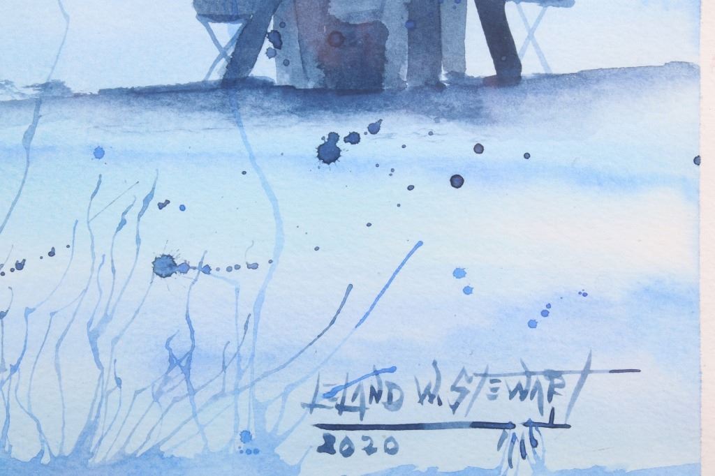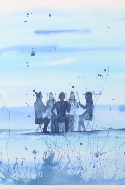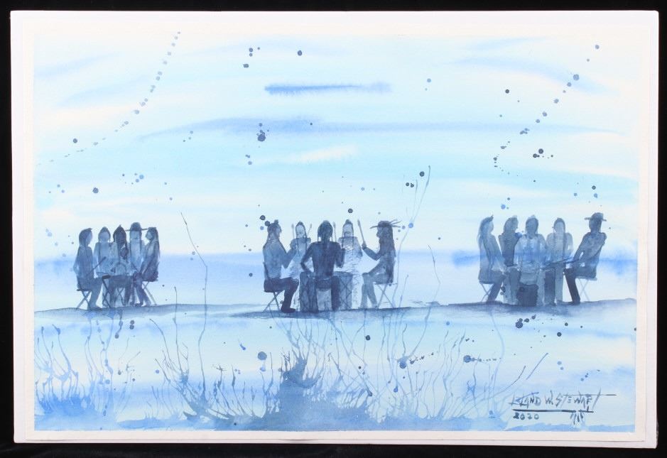 Included in this lot we have an original watercolor painting by Crow Native American Indian artist, Leland Stewart. Stewart is a member of the Crow Nation, Whistling Water Clan, and the High Hawk Society. He graduated from the Institute of the American Indian Arts in 1975. Stewart's artwork is featured in Montana fine art galleries and beyond. Many of Stewart’s works can be found at the Sam Terakedis Fine Art & Jewelry Gallery. For example, some of his art has been priced at: $6,200 for “Two Sisters in the Bear Paws”, $5,500 for “Uncle Buffalo”, and $6,000 for “The Visitor”. This painting displays the silhouettes of Native American figures seated around three drums. This original painting shows a wonderful art style in hues of blues and purples. The painting exhibits Stewart's unique style of bright, vivid colors and personal interpretation. The piece is signed in the lower right corner "Leland Stewart 2020". The watercolor is in very good condition. The painting measures 18" wide by 12 1/8" tall.