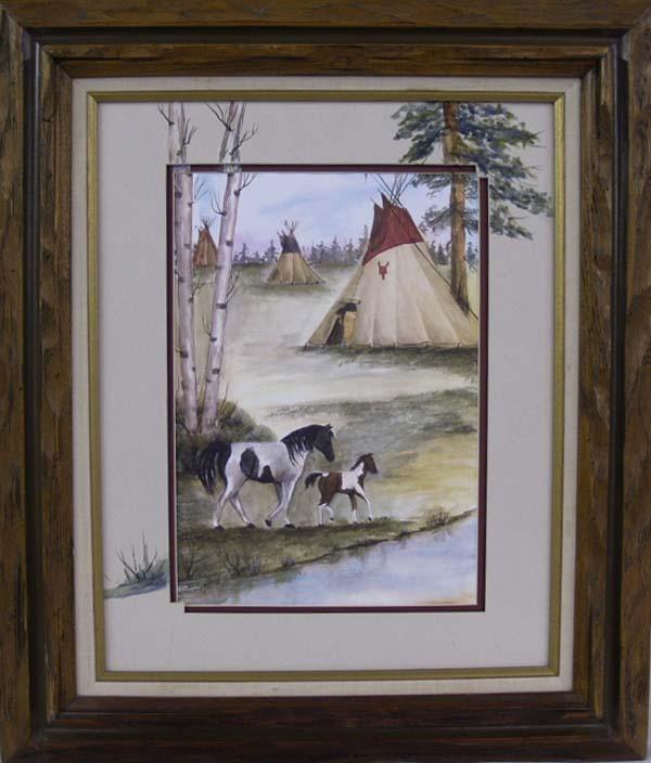 Original Watercolor by D. Eschleman, beautifully matted, measures 16'' x 20'' in double matted oak frame, 2003. SHI $75.
