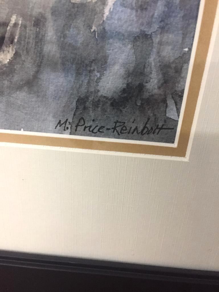 For sale in this lot is an original watercolor painting by M. Price-Reinbolt. It features a beautiful landscape of a canyon with a river winding through it and has vivid sunset colors of oranges, purples, pinks, and grays. Framed under glass with black frame. Maker: M. Price-Reinbolt. Approx. Age: Fairly modern. Size: 23" long X 19" wide with frame. Condition: Good for its age, normal wear expected. Please look closely at the pictures - they are an important part of our description. Shipping: There will be a $10 handling, packaging fee for shipping this lot. The actual cost of postage will be added on top of that.