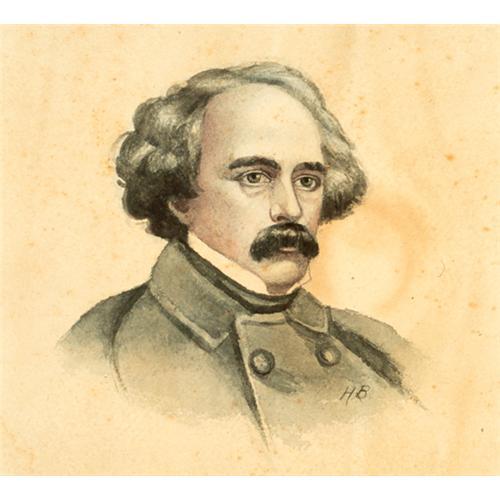 <Our item number 141007><B>[Hawthorne, Nathaniel].</B> Original Watercolor of Nathaniel Hawthorne, by "H.B.," 10½ x 12½ in. image, framed to 13 x 15 in., c. 1865, A head and shoulders vignette, carefully rendered. Paper is toned, but the image is still quite clear and distinct. Fine. <BR>Estimated Value $500 - 750. <BR><BR>Our item number 141007<BR><IMAGES><P ALIGN="CENTER"><IMG SRC="http://www.goldbergcoins.net/liveauction/49jpegs/141007.jpg"> </P></IMAGES>