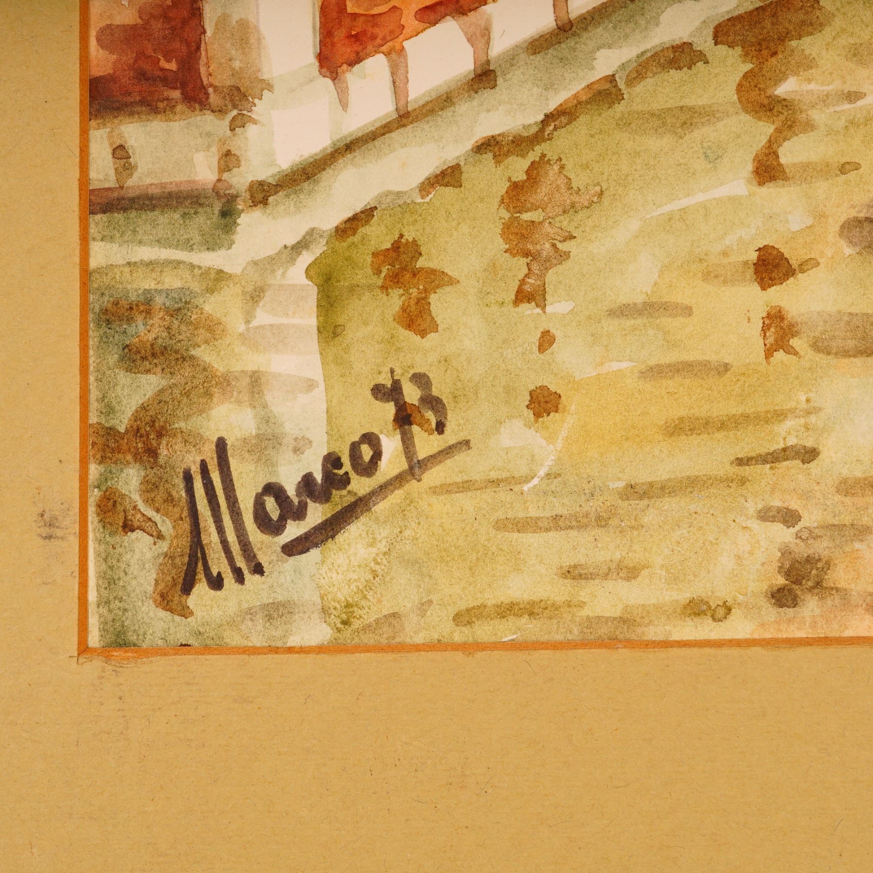 Charming watercolor painting depicting a gondolier navigating a quiet canal in Venice, surrounded by sunlit stucco buildings and arched bridges. The artist captures the romantic warmth and architectural detail of the Venetian cityscape with fluid brushwork and vibrant earth tones. Presented in its original gilt frame with matting, this work evokes classic mid-20th-century Italian tourist art styles emphasizing atmosphere and light. Signed and dated Marco 73 at the lower left.