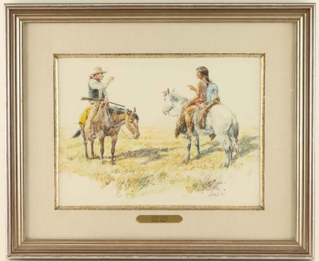 "Sign Talk" Signed lower right 'Hagel 87'. Image measures 9 7/8" x 12 3/4" with single mat and fillet that matches the pewter tone wood frame, excellent condition. Frank D. Hagel is a realist and impressionist painter and sculptor of the historical northwest and depicts the trappers, mountain men, Indians, and wildlife. He was born in Kalispell, Montana, in 1933, and has lived there since 1972. A member of the United States Navy from 1952-1955, Hagel had previous experience in construction, logging and ranching He graduated in 1959 from the Art Center College of Design in Los Angeles where he studied illustration. He worked in that field in Detroit, Michigan, eventually, in 1968, spending the Fall seasons in Montana, which would lead to his moving back to the state four years later. Hagel has also painted murals and sculpted medals. -AskArt