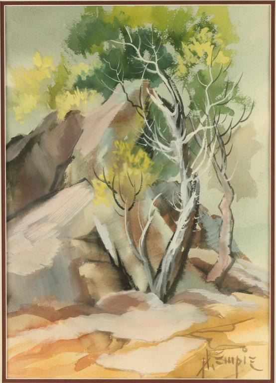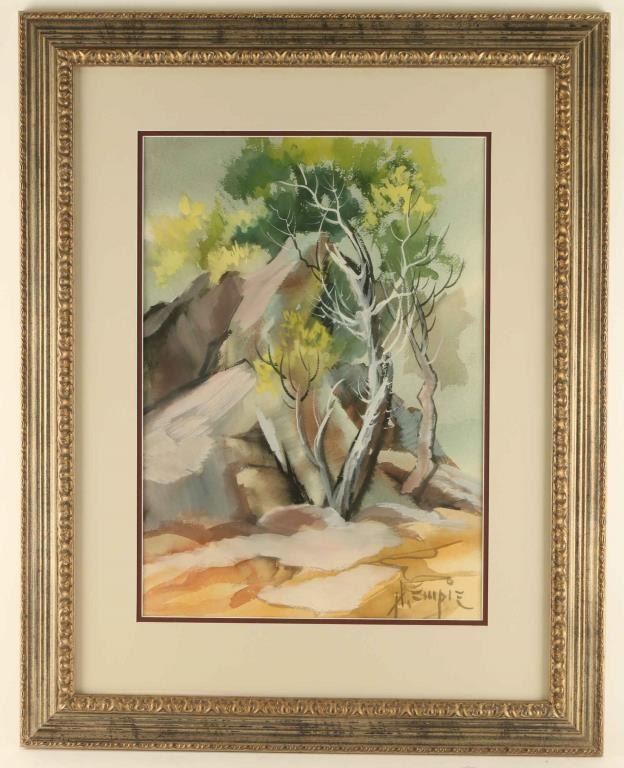 "The Summit" signed lower right. Image measures 19 3/4" x 12 3/4" in double mat and gold wood frame. Born March 26, 1909, a child of the Territory of Arizona who grew up with the state, Hal Empie held the dual distinction of being both the oldest continuous resident artist in Arizona's history and its youngest licensed pharmacist. His paintings, cartoons, drawings and sketches have appeared in many publications, nationally juried and invitational exhibitions, as well as the permanent collections of collectors, museums and cultural institutions throughout the country. He was also the creator behind the Empie Kartoon Kards and Porqupine Aiggs, artistic novelties.