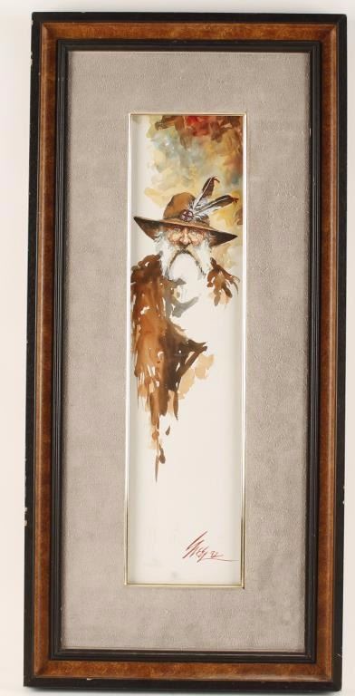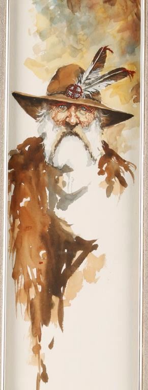 by Larry Greer entitled "The Mountain Man". Image measures 16"x4 1/2". A native Oklahoman, Larry took much of his subject matter from southwest Oklahoma. Primarily a figure painter, Greer used several media in creating his art stating the connecting thread that tied the diverse media and techniques together was drawing-the key to all successful painting. Greer received his degree in art from Southwestern Oklahoma State University. His art work can be found in public and private collections throughout the United States.