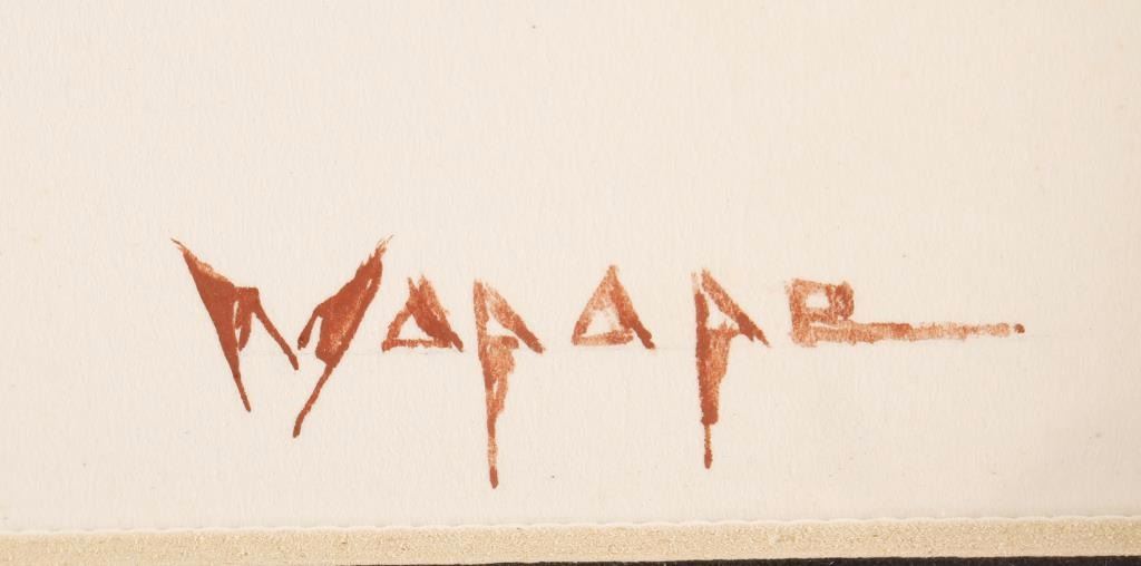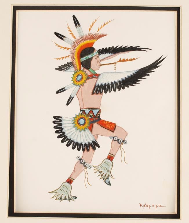 by noted Oklahoma artist Stephen Mopope. Depicting Pipe Dancer. Signed lower right hand corner. 8"X10 1/2". Stephen Mopope Qued Koi, Wood-Coy, "Painted Robe" (1898-1974), was born and raised on the Kiowa Reservation, Indian Territory, later to become Oklahoma. He was primarily a painter and dancer most of his life. "Mopope's grandfather was a Spanish captive, kidnapped by the Kiowas from a wagon train crossing the prairie and reared by Chief Many Bears. On the Kiowa side he was a descendant of Appiatan, a noted Kiowa warrior. His granduncles were Silverhorn (Haungooah) and Hakok. They found him drawing designs in the sand and decided to teach him how to paint on tanned skins in the old Kiowa way. Mopope's childhood education by his grandmother was in the Kiowa tradition. [He also studied with Susie Peters of the Kiowa Agency in Anadarko, Oklahoma, and at the University of Oklahoma, Norman, in the late 1920s]. He is one of the original Kiowa Five [the "Five Kiowas" at the University of Oklahoma] and was primarily a painter and dancer most of his life." Source: Snodgrass, American Indian Painters 1968. Stephen Mopope broke out of the Kiowa tradition of painting by including more figures in his narrative paintings. His work is represented in Kiowa Art and his paintings have been exhibited all over the world. His commissions include murals for the United States Department of the Interior, Washington, D.C. (I938), as well as works sponsored by the Works Progress Administration and the Public Works Administration. Mopope's many awards include a Certificate of Appreciation by the Indian Arts and Crafts Board, United States Department of the Interior.