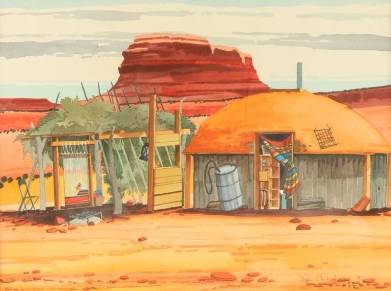 by Baje Whitethorne depicting a Native desert home. Signed lower right. Image measures 10 3/4"x14 1/4" in double mat with wood frame. Baje Whitethorn was born and raised on the Navajo Reservation in northeast Arizona. He inherited his artistic talent from his mother an expert rug weaver. Whitethorn began sketching horses at the age of five. He took art classes at the government boarding school and at Grand Canyon College in Phoenix but he did not pursue a career in art until later. In 1986 Whitethorn, working in a position testing nuclear reactors, rejected an offer to relocate to Argentina and began pursuing a career in art full-time. He began selling landscapes for $75 at local craft shows. His prices quickly increased as his popularity grew. Whitethorn began illustrating children's books in 1990 with "Sunpainters: Eclipse of the Navajo Sun." He has also illustrated a variety of Navajo legends. In 1998 he was named, "Outstanding Contributor to Children's Literature" by the Arizona Library Association. In 2002 Whitethorn was chosen to be the Indian Market poster artist.