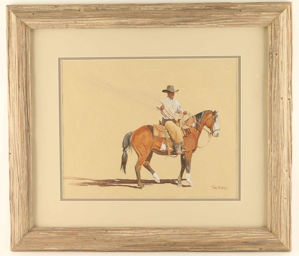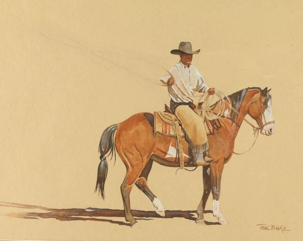 by noted Arizona CA Artist Teal Blake entitled 'Riding the Queen of Diamonds". Depicts an Arizona paint with rider. Image measures 14"x12". Double mat and frame.