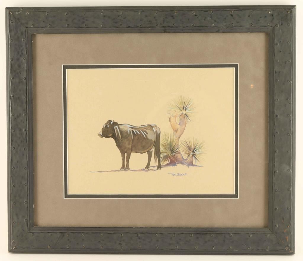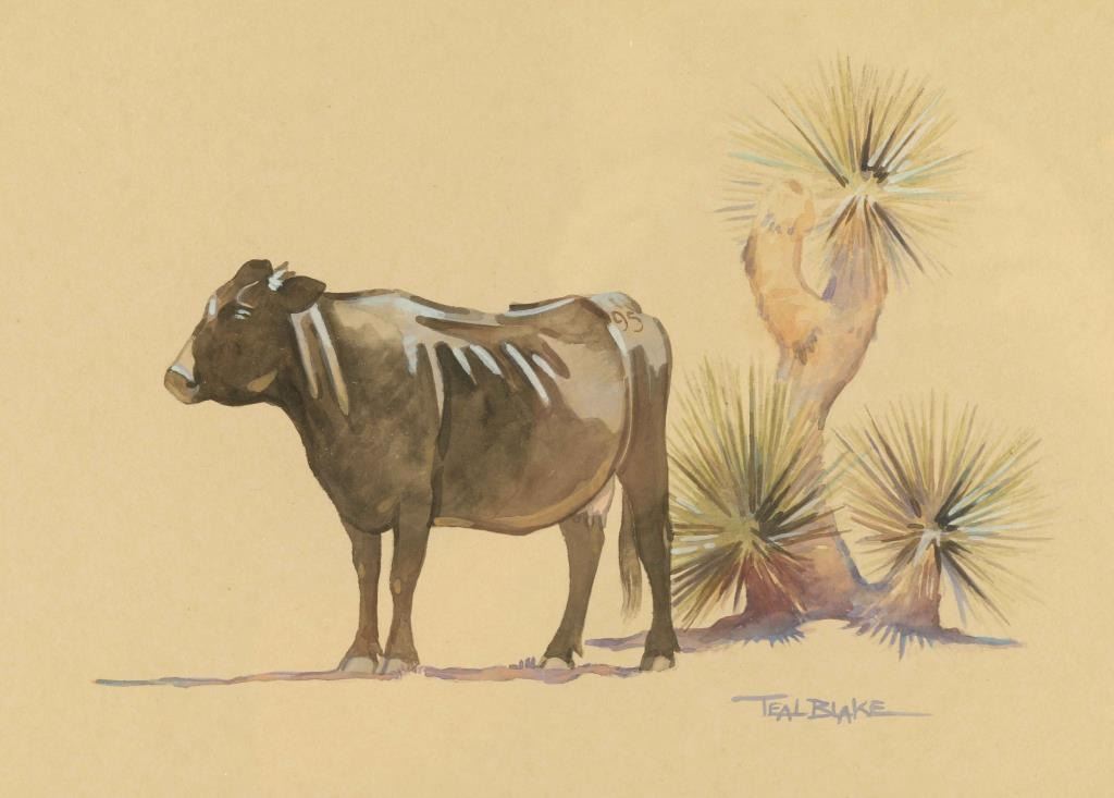 By noted Arizona CA artist Teal Blake entitled "Desert Cow". Image size is 12"x9" in double mat and frame.