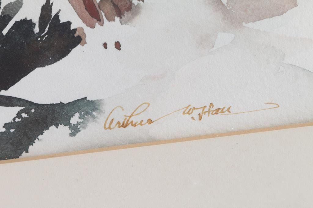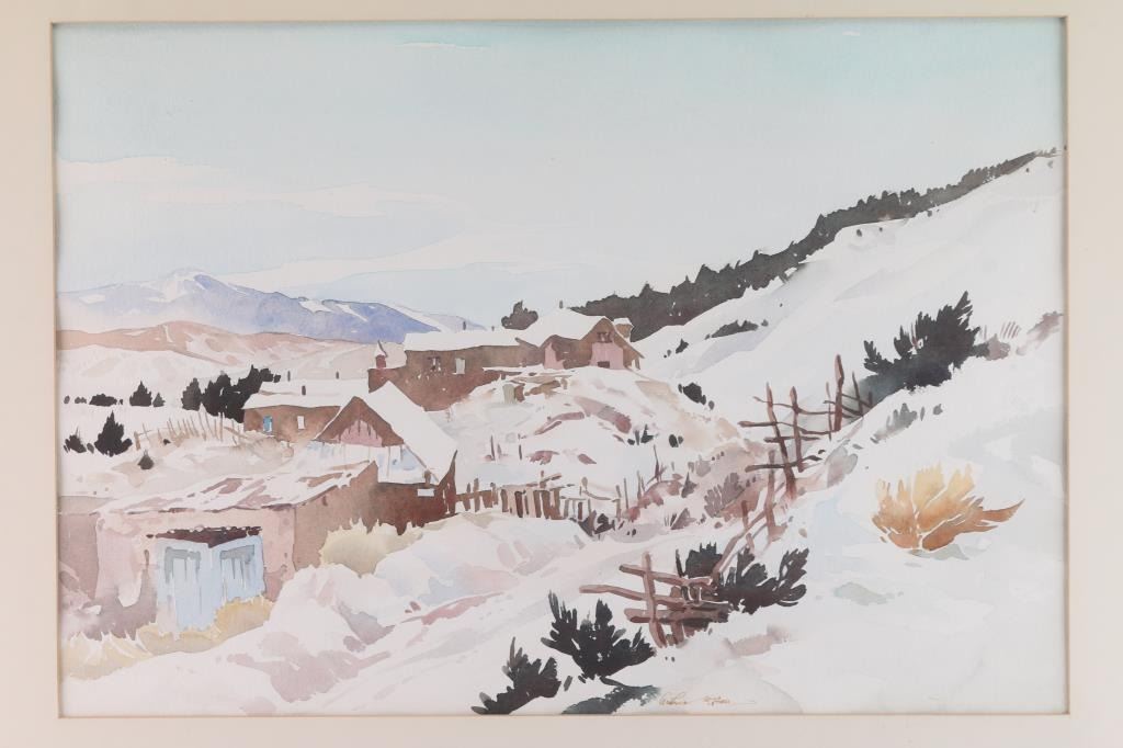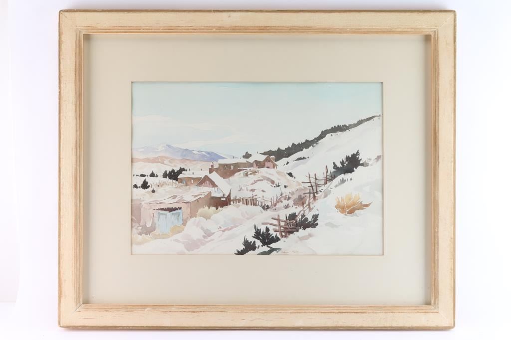by Arthur Hall depicting farm house in the snow. Hand signed in white washed frame 21"X15" (1889-1981)Arthur Hall best known for etching of southwest scenes, studied at Chicago art Institute served in the US Military died in Sun City Arizona.