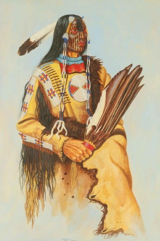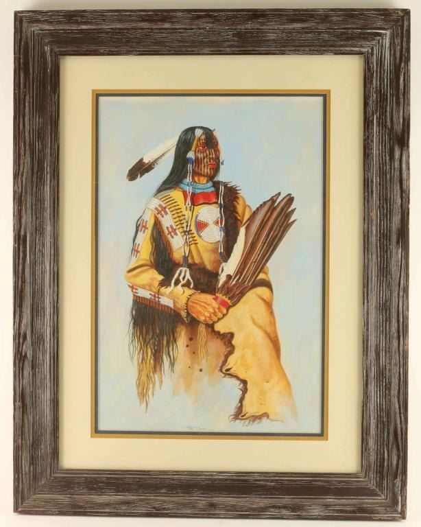 by Paul Surber entitled 'Sioux Warrior',24"x20", gallery priced at $2000. Paul Surber was born in Redlands CA., in 1942. His first encounter with Indians was in a Parade when he was five years old. Attracted to the colorful and ornate costumes, he went home to draw with his crayons what he had seen. Paul has been drawing and painting Indians ever since. He is known for paintings of Indians and landscapes in oil, acrylic, and gouache. He has spent much of his life living close to the source of his inspiration, the Crow Indian Reservation in Montana and the Taos Pueblo in New Mexico. Surber now divides his time between Montana and Arizona.