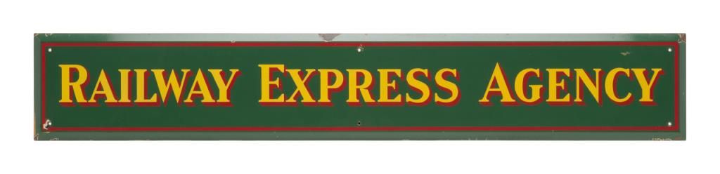 Original Wells Fargo Express Agency enamel on tin sign in three colors, yellow and red on a green background. Measures approximately 72” x 12”. Very good plus to near fine condition with some slight losses and normal aging only. Guaranteedauthentic from the premier Robert Hoelscher collection. Est.: $600-$1200