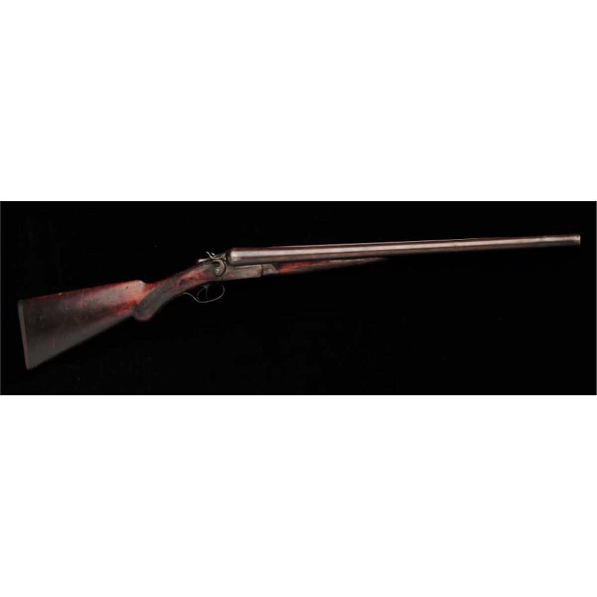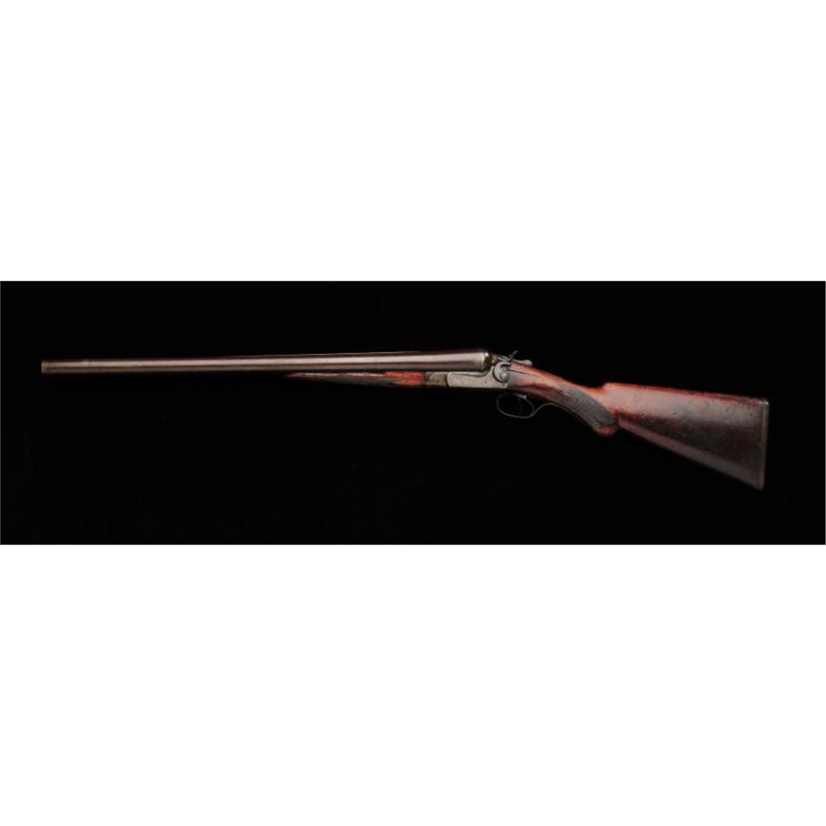 Original Wells Fargo marked Ithaca 10ga double-barrel exposed hammer shotgun, serial #185458. With factory 24” barrels. Left side of frame shows “W. F. & CO. EX P. 444” Originally sold by Sotheby Parke Bernet,September 1973, Gerald Fox Collection, lot 688. With original receipt and factory letter identifying this gun as one of the first 30 sold by Ithaca in 1909 to Wells Fargo. The gun remains in good original condition with30-50% original brown and case hardening going to a natural patina with slight erosion and normal aging. The stocks show damage and repair where the wood meets the top of the action and carry and use. The originalbuttplate is retained. The forend shows cracks, losses of wood at the edge, dents from carry and use. The action is good, the bore is very good. An impeccably documented Wells Fargo marked shotgun with superbdocumentation. From the Robert Hoelscher Collection. Est: $5,000 - $10,000