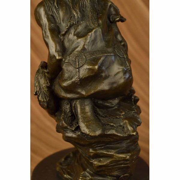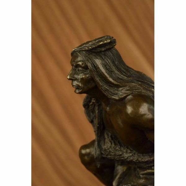 A Native American warrior sits on a rugged stone. He grasps his hand-carved spear firmly in his hand. As he leans and rests on his hand he stares at his land with a wise appreciation that understands the sacrifice and strength required to sustain it. This experience warrior has acquired many feathers from acts of bravery. These feathers are placed graciously on the side of his long hair. This sculpture encompasses history, honor and courage . The sculpture was crafted using the lost wax method. It stands on a dark marble base. Condition: This sculpture is in perfect condition. Bronze Dimensions with Marble Base:Height 13" x Width 7" Marble size: Diameter 7 " Height without base:12" Weight : 15 LBS Inventory : 25Y9295952