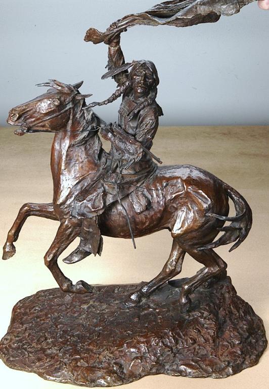 Original Western bronze by Ernie Burke entitled War Signal, showing brave on horseback with Springfield rifle. Approx. 18-1/2”h by 18”w. Numbered 6 of only 20 in the edition. From the Robert Petersencollection. Est: $2,500 - $5,000