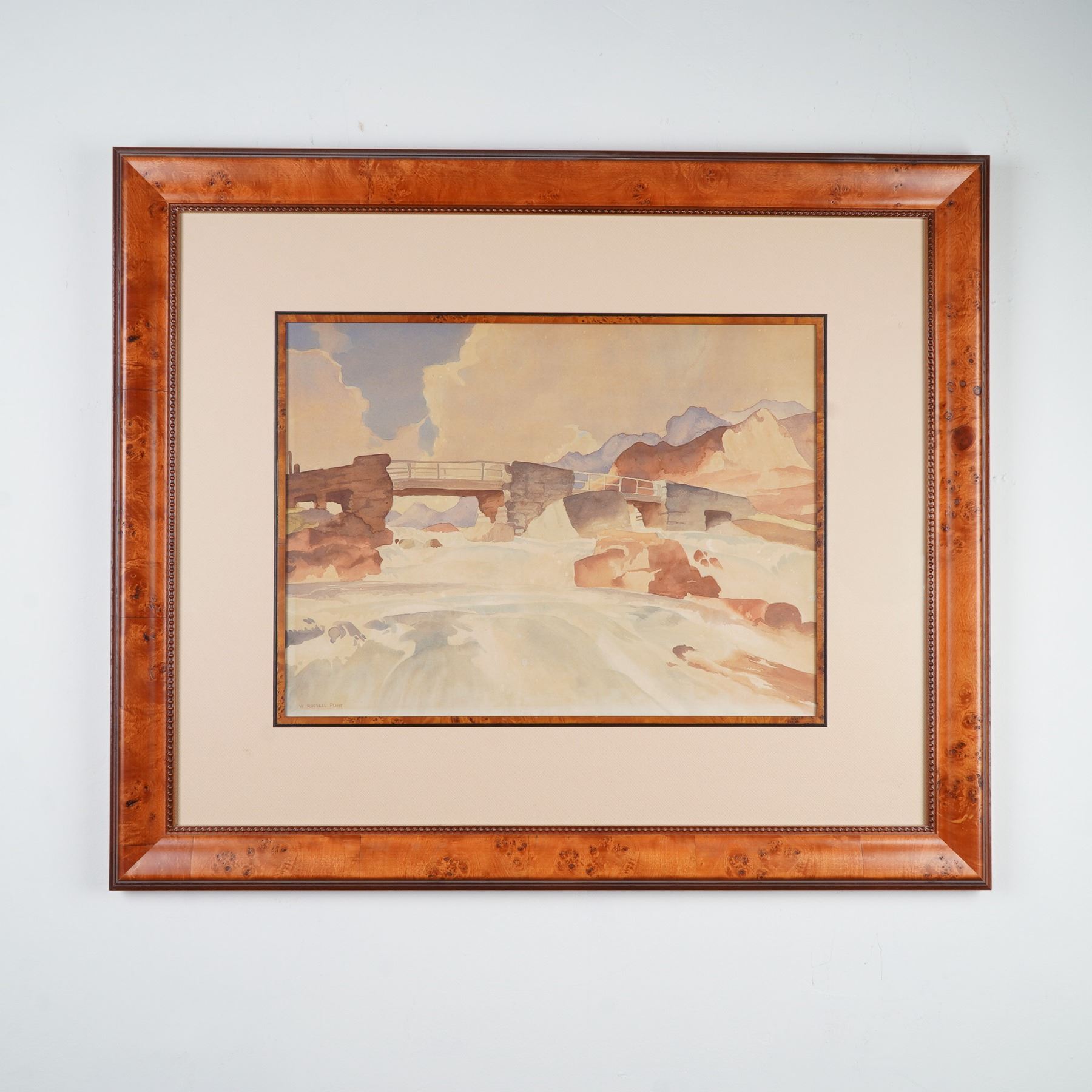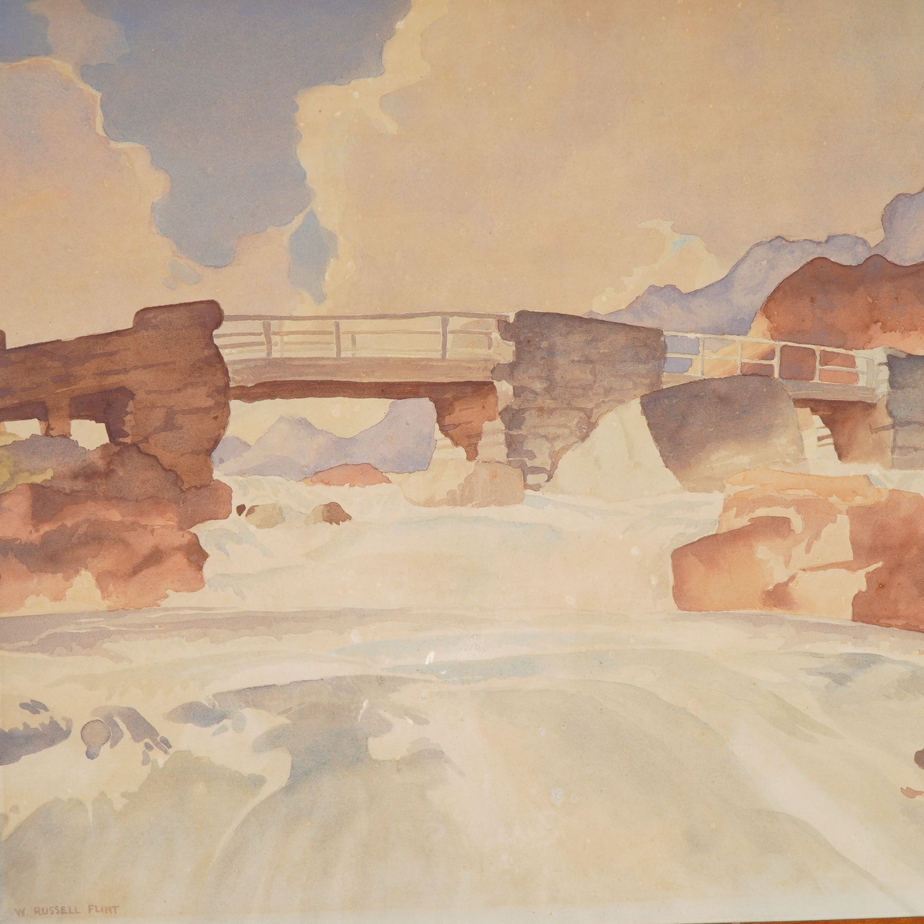 Original watercolor by Sir William Russell Flint, depicting a mountainous landscape with a rustic stone bridge spanning a rushing river under a dramatic sky. Signed lower left W Russell Flint, this piece showcases the artist's refined control of watercolor washes and light to create atmosphere and movement. Known primarily for his graceful female figures and romantic European settings, Flint was one of the most accomplished watercolorists of the 20th century. He served as President of the Royal Society of Painters in Watercolours and was knighted in 1947 for his contribution to British art.