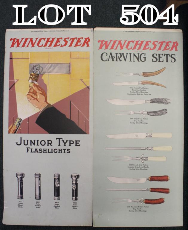 Original Winchester large color cardboard advertising panels, each approx. 40” X 18” and each presenting two-sided ads. The first panel has “Junior Type Flashlights” pictured along with a demonstration of how the lightscan help opening a lock at night; on the reverse of this panel is an ad for Winchester screw drivers. This ad panel is overall good on the flashlight side and fair on the screw driver side with some losses and a tear onone side of the bottom quarter of the panel; the second panel advertises Winchester Carving Sets on one side and is in overall very good condition; the other side is a portion of a five-part panel advertisingWinchester adjustable wrenches. The two best panel sides (Flashlights and Carving Sets) would look great framed and hanging in the gunroom of a serious Winchester collector. Est.: $150-$300.