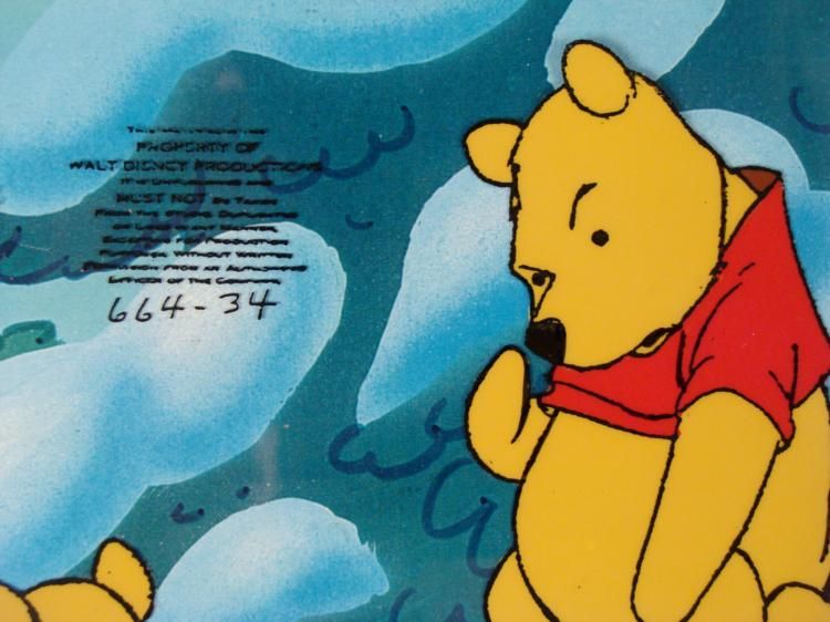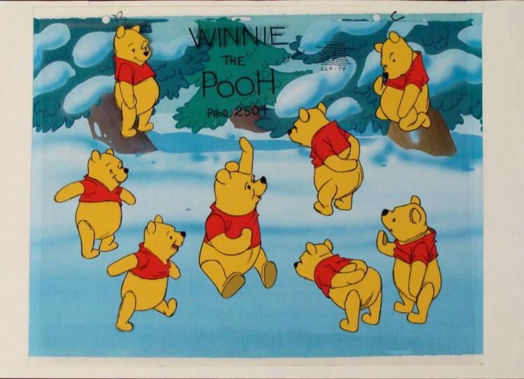 Pooh is a classy bear. * * * Original Animation Cel & Printed Background * * Medium: Hand painted acetate celDetails: Animation notations and peg holesSize of cel: 10 1/2 x 12 1/2 inchesSize of background: 11 x 17 inches * * Condition: Very good * * * This is an original hand-painted cel set-up used in the production of the "Winnie the Pooh." Each one-of-a-kind set-up represents a slight change in position of the characters. When individually photographed and projected in rapid succession, the images appear * to move. To created production cels, the original animator's drawing is transferred onto an acetate cel (by hand-inking and/or photo copying). The cel is then hand-painted on the reverse side. The background accompanying this cel is a printed reproduction * background. *