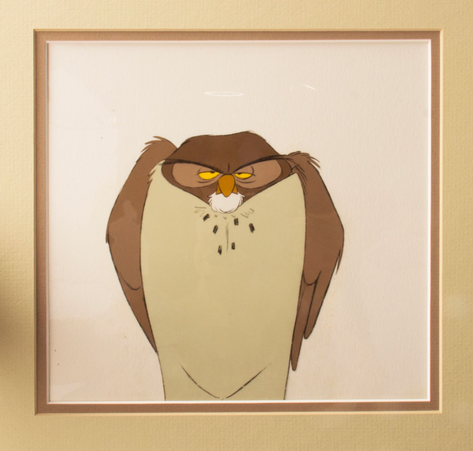 (Walt Disney Studios, c.1983) An original production cel of Owl from Winnie the Pooh and a Day For Eeyore. This hand-painted cel features a fantastic large image of this memorable character in a great pose, and comes displayed within a mat. The cel has an image size of 7.5"x8" within the 13.25"x13.5" mat. The condition is good with some surface wear to the cel sheet.