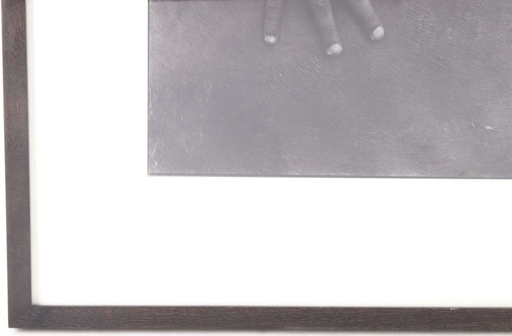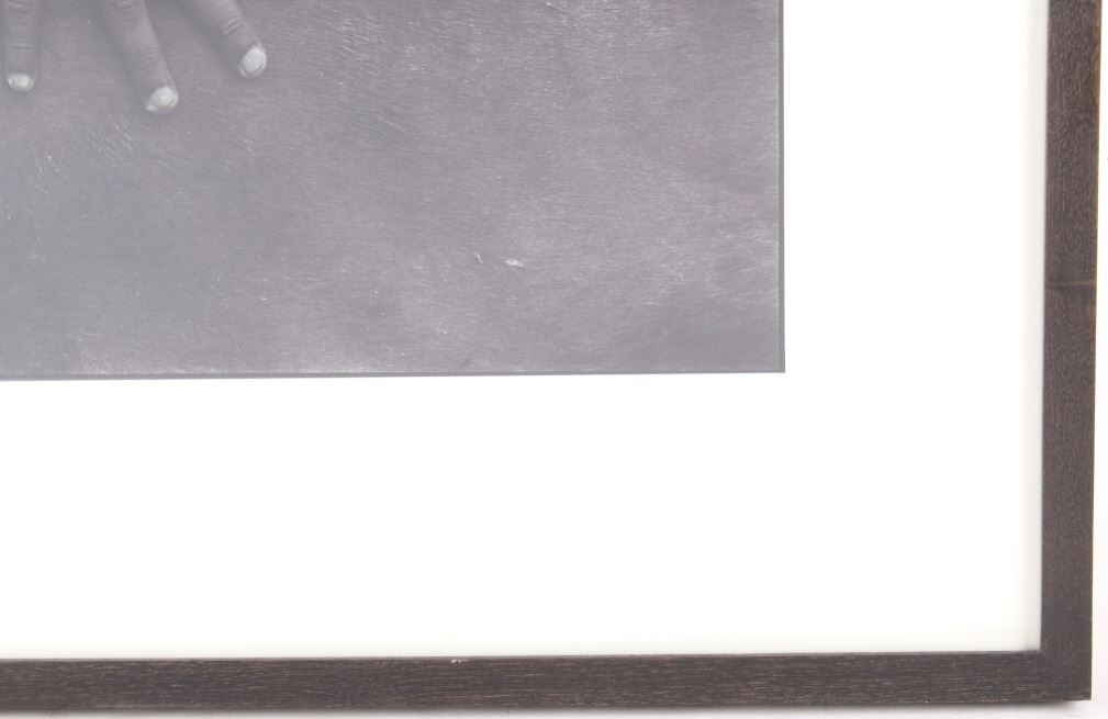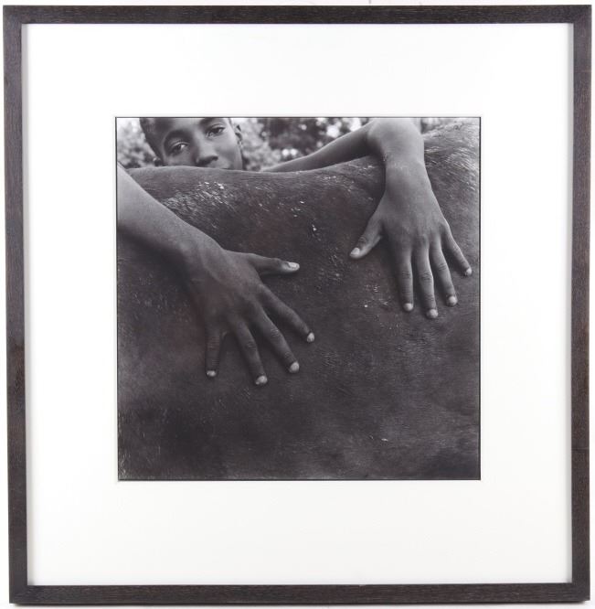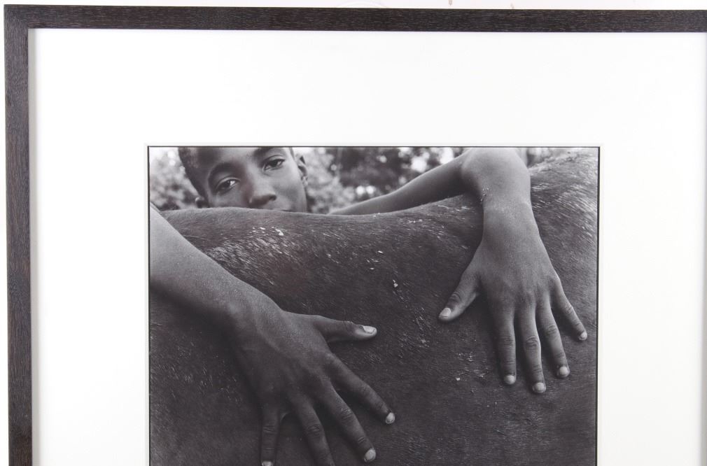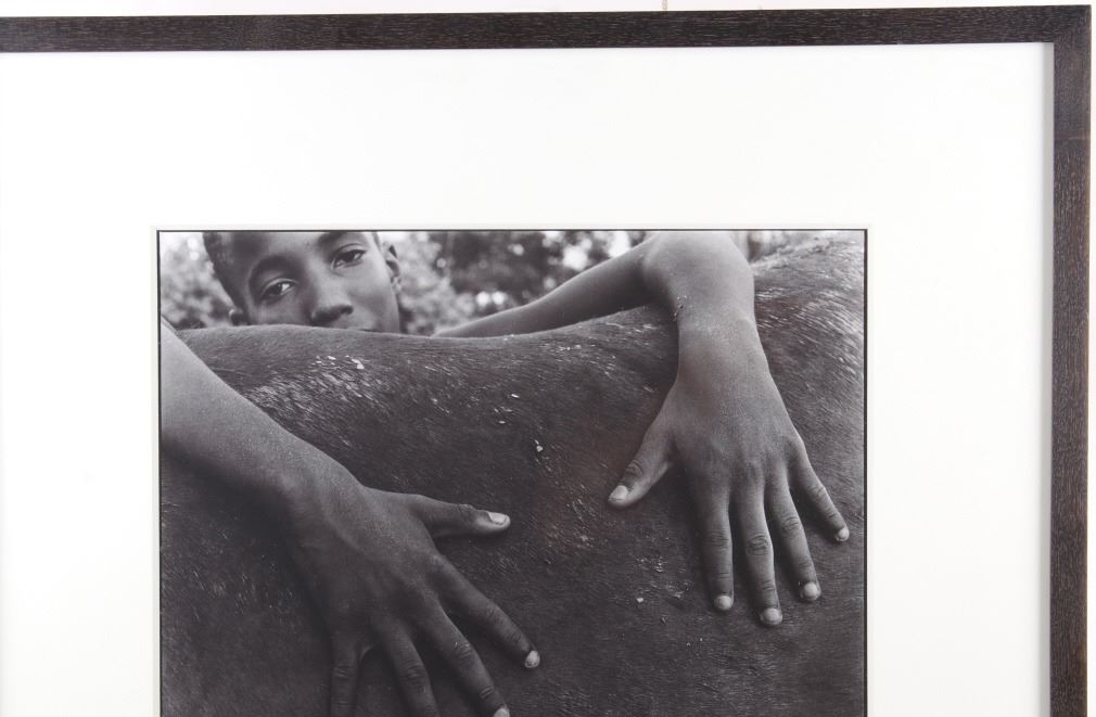 For your bidding pleasure is this original Wouter Deruytter gelatin silver. This a good gelatin silver from the artist, Wouter Deruytter. Deruytter was born in 1967 in Belgium. Wouter Deruytter is well known for his images of masks and costumes and more recently for his collection of American western culture. This gelatin silver shows a boy of color hanging on to the backside of a black horse. The measurements of this framed gelatin silver are 24 1/4" x 23 1/2" and the measurements of the visible art are 14 3/4" x 14 3/4".
