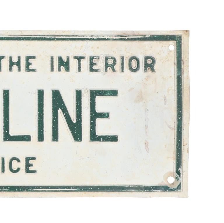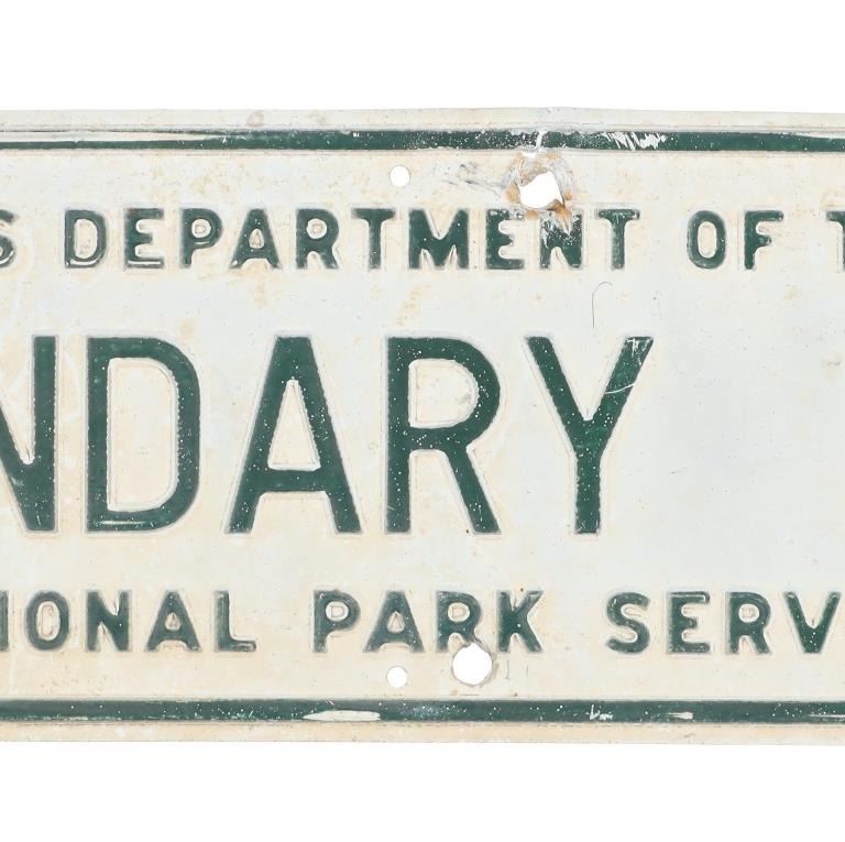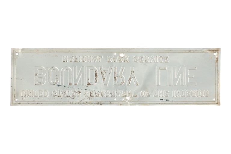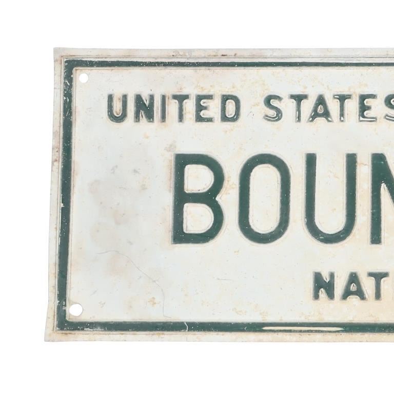 For your consideration is an Original National Park Service Boundary Line Sign from Yellowstone National Park, circa 1890 to early 1900s. Most land surrounding Yellowstone national park is managed and protected for the public by the US Forest Service. Private lands near these park areas are widespread and intermittent, but primarily occur at lower elevations. The sign reads "United States Department Of The Interior BOUNDARY LINE National Park Service". The sign has the original six holes for mounting, two additional holes in the center top and bottom appear to have been used for mounting the sign. The sign is in good overall condition, lettering paint displays age related weathering, oxidation, with small dents and missing paint. Measures 4"W x 14.75"L
