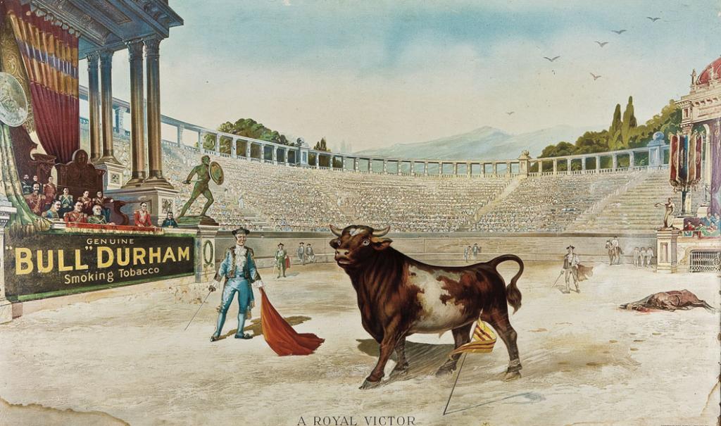 Original advertiser for Bull Durham Tobacco showing matador in bull ring retaining its original marked frame. The lithograph is in good condition with some staining, spotting and small losses, some minor losses at the edges, the frame shows some areas of damage, scratches, small loss of veneer, but generally good overall and absolutely original to the early 20th century. The bull fight scene was popular in the American Southwest from Texas to California and these advertisers often hung in bars, barber shops, and bawdy houses that catered to a male clientele. Est: $1,500 - $3,000