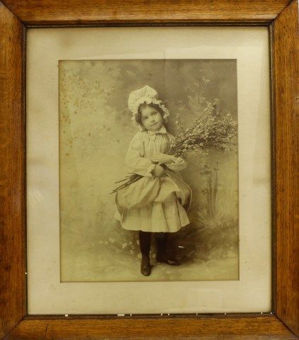 of little prairie girl posing with bouquet of wild flowers, original oak frame and matting, "Springtime" copyright 1897 by Taber Prang Art Company, 27" X 31. Est. 350-500