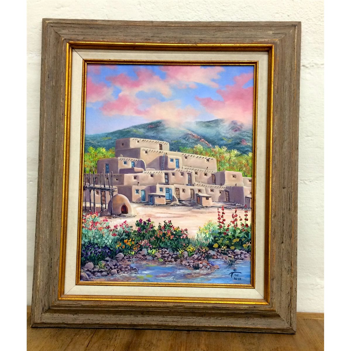 This colorful original is of a Pueblo style home against a mountain backdrop. It measures approx. 21” wide by 25 ½” tall including the frame.