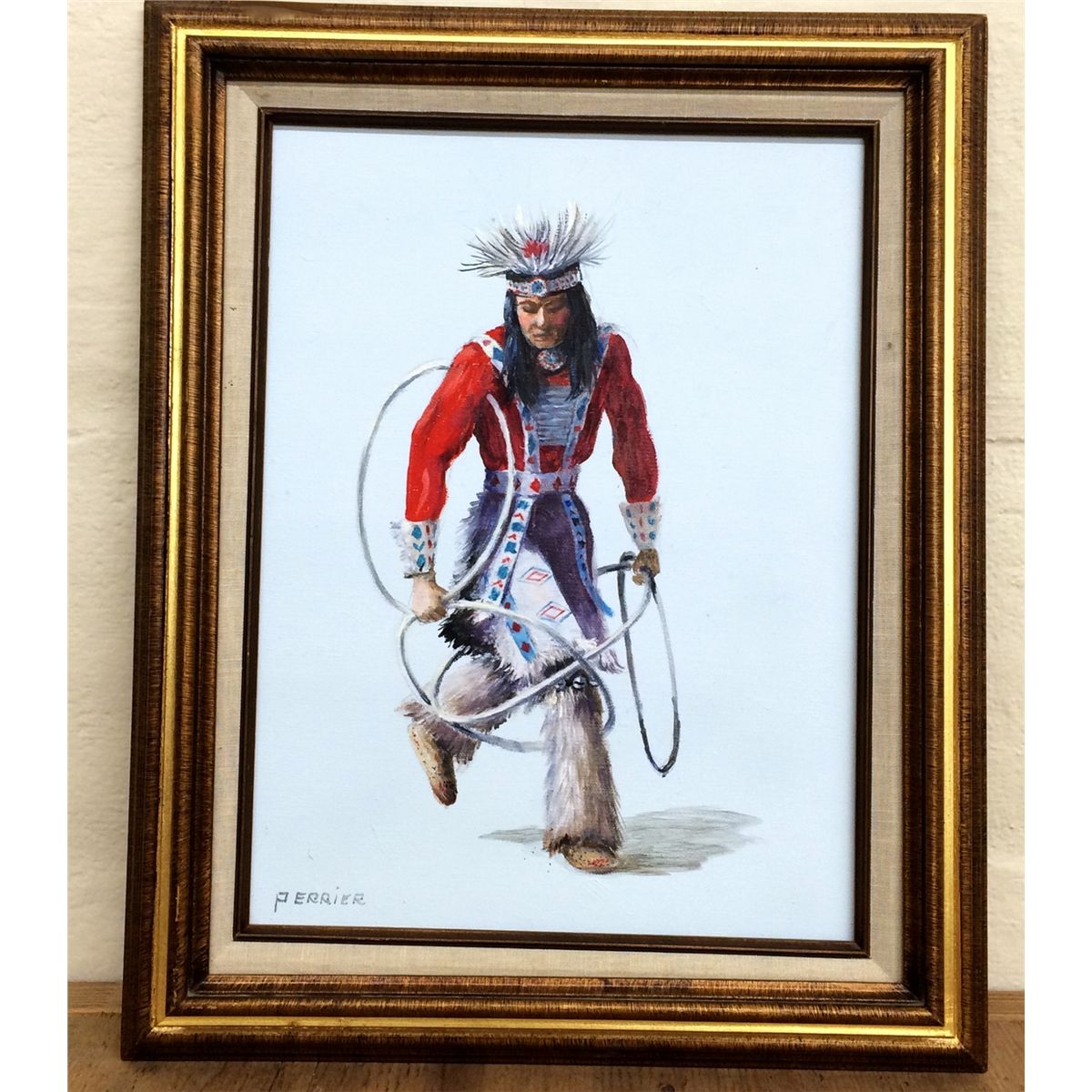 This great oil on canvas shows the “Hoop” dancer. It measures approximately 16 ½” wide by 21” tall including the frame.