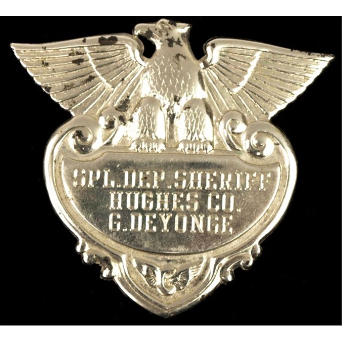 Original badge marked Spl. Dp. Sherriff Hughes Co. G Deyong for prevoious sherrif George DeYonge "1907-1997" of Pierre SD.