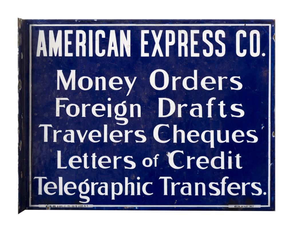 Original blue and white enamel on metal American Express Co. multiple services business sign in overall very good condition dated June 1907, approx. 13” x 17”. Est.: $300-$600.
