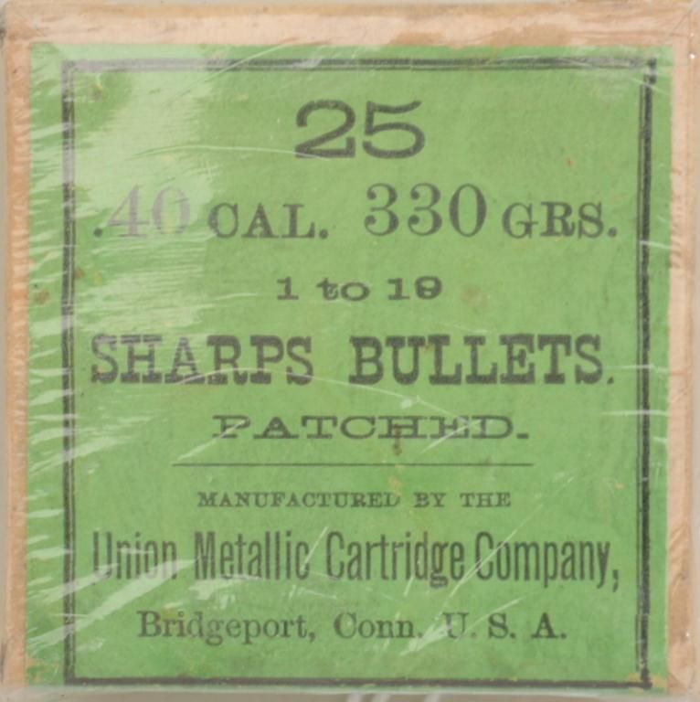 Original box of 25 Sharps Patched Bullets by Union Metallic Cartridge Company in .40 caliber, 330 grs. In overall very good to fine condition; a great Sharps accessory for the cartridge or Sharps rifle collector.Est.: $75-$150.