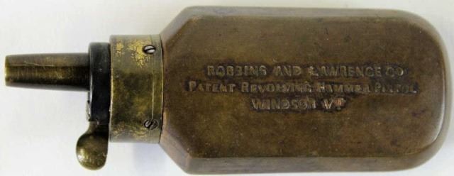 Original brass powder flask for cased Robbinsand Lawrence paper box pistol with 3 line eraised letters on the body C. 1850's, fine condition, 3 1/2" long. From the John Hunter collection. Est. 200-400