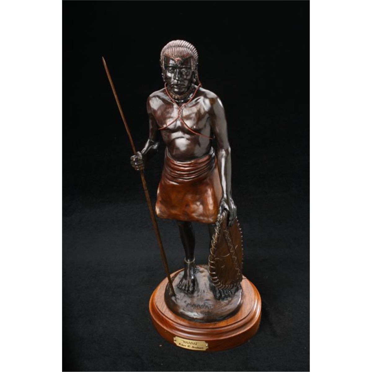Original bronze entitled Maasai by Robert W. Broshers, numbered 1 of only 35. Dated 1997. The bronze measures approx. 20” in height including base and accurately portrays a legendary Maasai warrior with shield, spear,and detailed costume that is correct in every regard. Auctioned off at a Safari Club banquet, the first in a very limited series. Est: $3,000 - $6,000