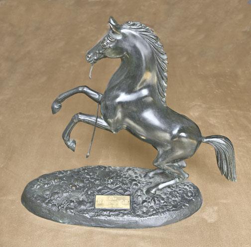 Original bronze entitled The Rampant Colt by Alvin White, numbered “40 of one hundred”. Alvin White, now deceased, was one of the premier engravers for Colt in their reintroduction of the Colt Custom Workshop,in the 1960’s and 70’s. He was the master engraver of A. A. White firearms and was a well-accomplished artist in most mediums, not only steel engraving. This is an original, and these are always desirable to Coltfirearms collectors. Approx. 21-1/2” by 25-1/2”. h From the Robert Petersen collection. Est: $ 1,500- $3,000