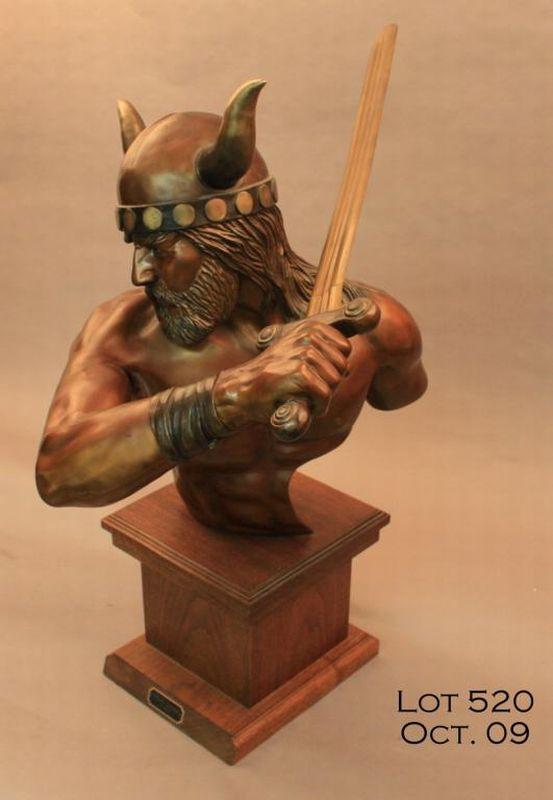 Original bronze entitled "Viking Raiders" by J Stout dated 1988 and numbered 3 of 6. Measures 35" in height including base or 24" in height excluding base. Nice patina and Hi-Quality. Est. $800-$1600.
