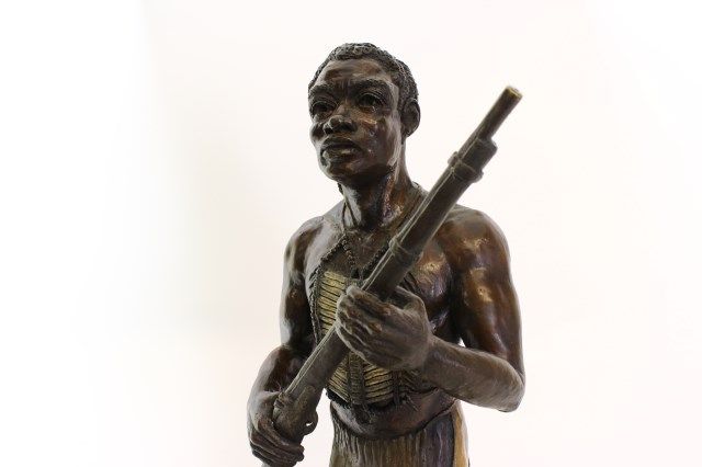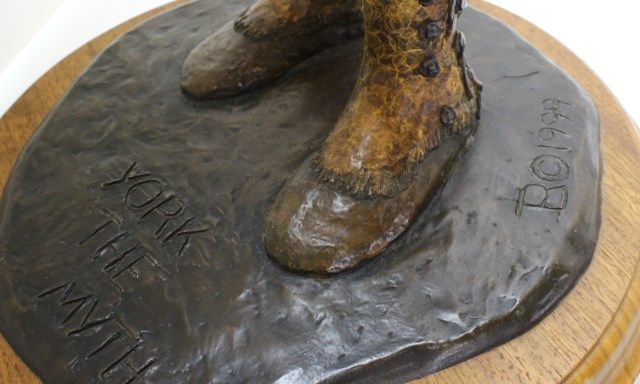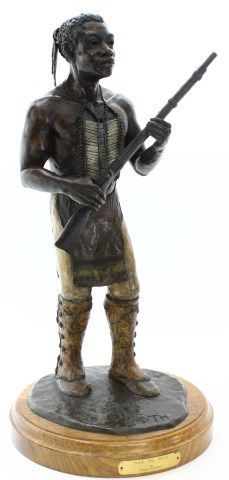 artist Porter Williams dated 1999. York was a slave that belonged to Clark of the Louis and Clark Expedition and a full member of the group as well as the only black member. Once saved Clarks life during a flood on the Missouri and later freed by Clark, bronze depicts York during the expedition wearing leggings, high top moccasins, loin cloth and breast plate and holding period correct flintlock musket, his back shows marks from his early days in slavery, stands 22" tall. Est. 4000-5000