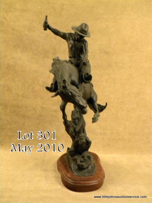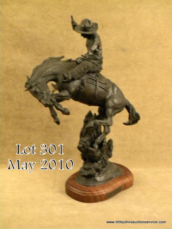 Original bronze of Cowboy on bucking bronco. Cowboy wearing wooly chaps, Colt single action in a holster, and complete gear, holding a bottle of whiskey while he hangs on. Entitled "Getting High" by Jack Bryant, #15 of 20. Measures approx.20-1/2" in height, not including base. Jack Bryant is a well recognized Texas artist and we would estimate the retail of this bronze at $2,500+ at a premium gallery. Est: $600 - $1,200