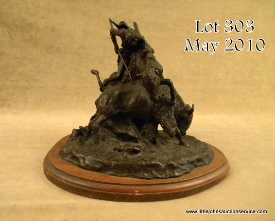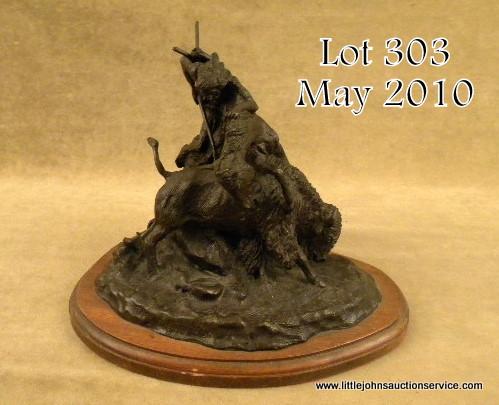 Original bronze of Indian fighting buffalo on horseback by Jack Bryant #1 of only 10. Measures approx. 8" in height, not including base. Well known Texas artist. A very limited edition, and the first in the series. We would estimate theretail of this bronze at $800-$1600 at a premium gallery. Est: $300 - $600
