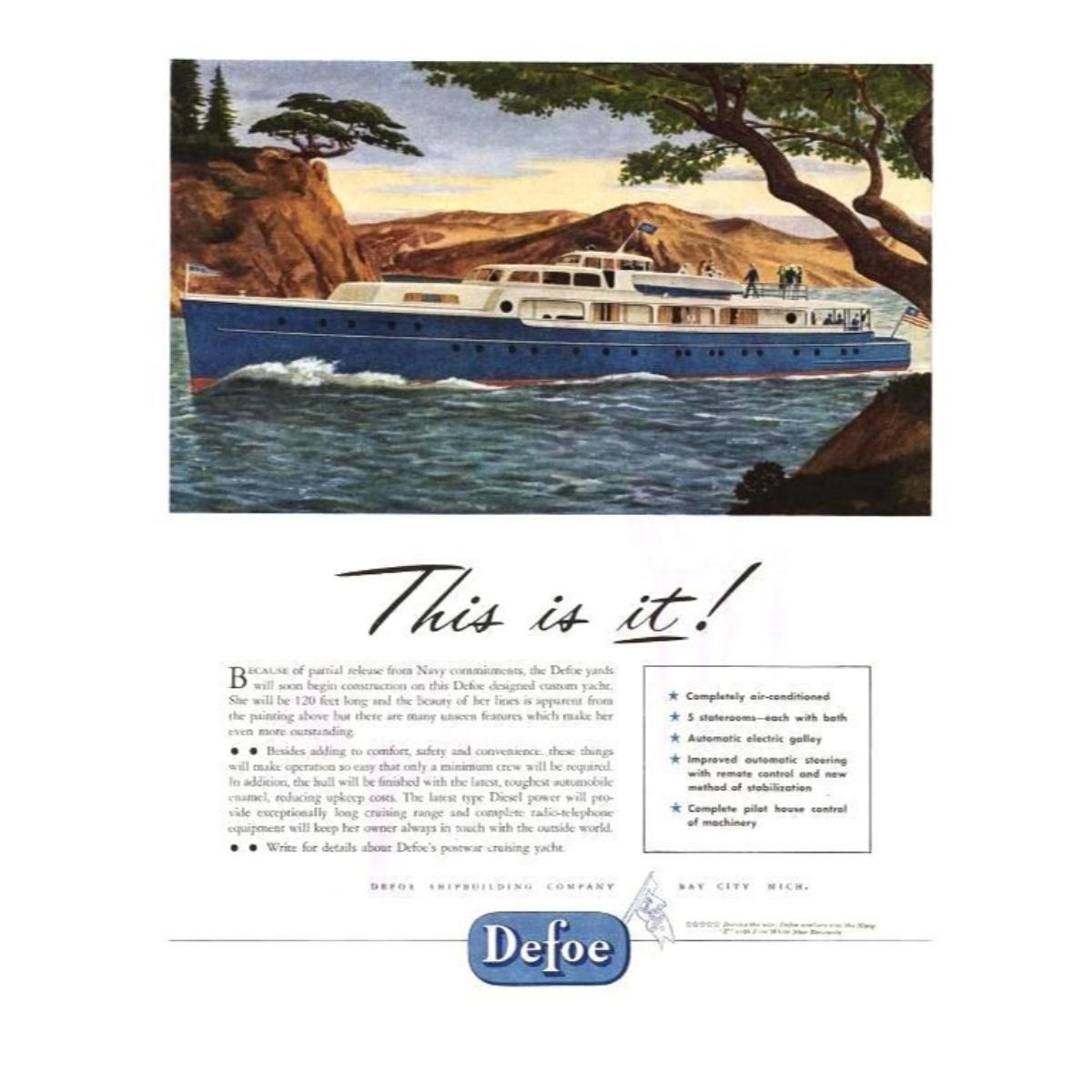 Original post-WWII luxury yacht magazine ad. Photo depicts a beautiful yacht with crew & a slogan below that reads, "This is it!" The ad introduced a 5 stateroom, air-conditioned yacht. 11" X 13 1/2" mounted on archival linen for preservation.Â