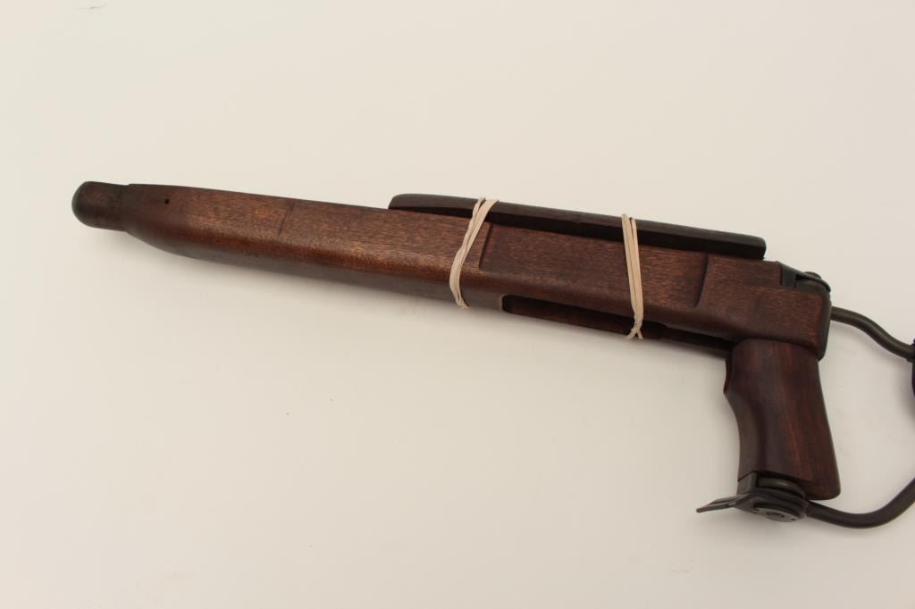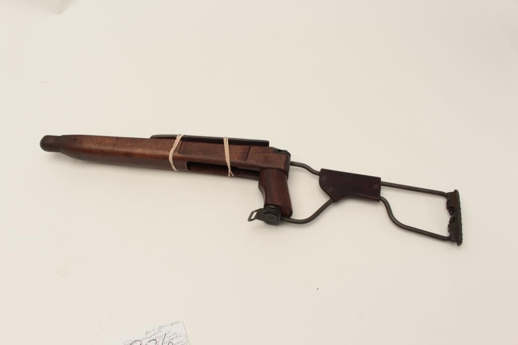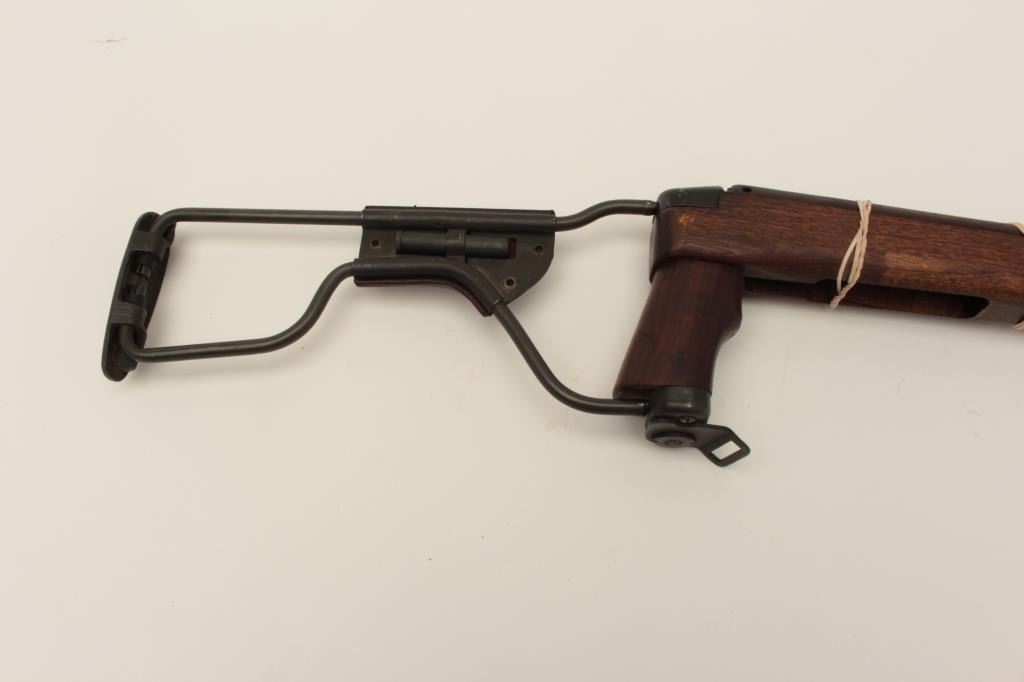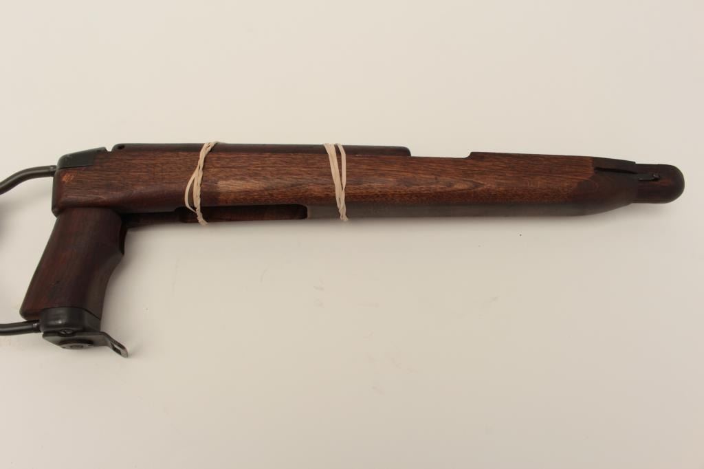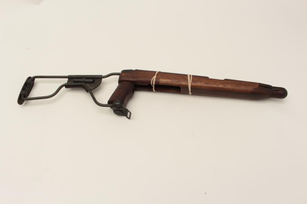 Original carbine stock and forend for a U.S. M1 Paratrooper, with oiler and good ordinance wheel cartouche; also marked “O.I.” (Overton for Inland G.M); original marked butt plate; near fine condition overall with smallscratches from storage. Est.: $800-$1,600.