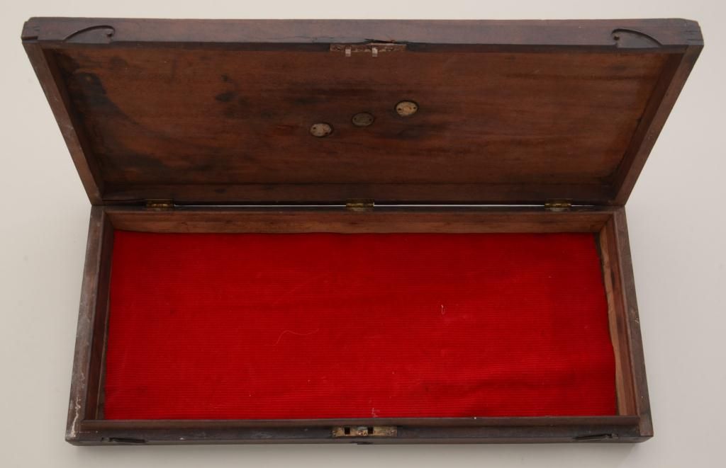 Original case for dueling pistols of English origin, circa late 18th, early 19th century, showing classis veneered mahogany exterior, brass pull with brass latches, missing its key plate. The exterior of the case is fairto good with small scratches, normal aging. The case measures approximately 18-1/2" x 7-1/2" interior dimensions; the exterior dimensions are nearly 8-/4" x 20" wide and about 2-1/2" deep. The upper portion of theair seal on the box shows an old repair with replacement of wood. Impossible to find when you need one and it increases the value of flint duelers dramatically, even if relined. Est.: $350-$700