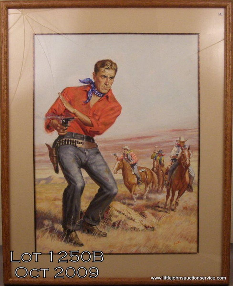 Original color mixed media on board by Barton showing a gunfighter in the fore ground and three horsemen with guns blazing in the background, approx. 24” x 18” image size, approx. 31” x 25” framed and matted. This quality piece was likelydone in the 1950’s or 1960’s for a Western novel’s dust jacket or advertiser. In fine condition. Est.: $1,500-$3,000.