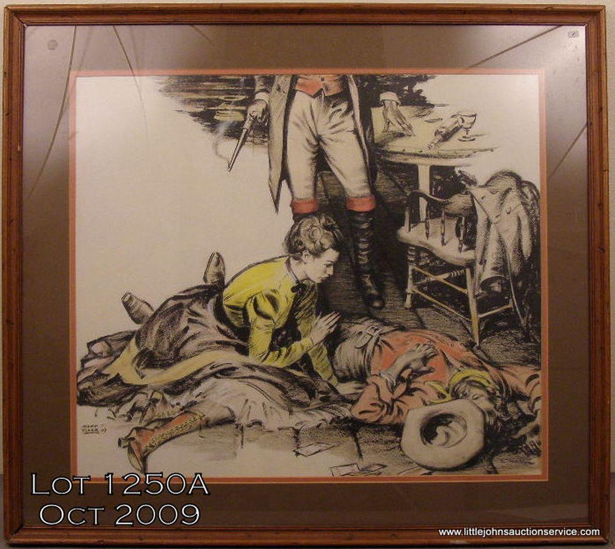 Original color mixed media on board by Matt Clark showing the aftermath of a gunfight in a saloon between a gambler and a cowboy with the “heart of gold” saloon hostess attending the fallen cowboy. This quality piece is dated ’48 (1948), is in fi condition and is approx. 19” x 22” image size and framed and matted size, approx. 26” x 29”. It was likely done for a Western novel’s dust jacket or advertiser. Est.: $1,500-$3,000.