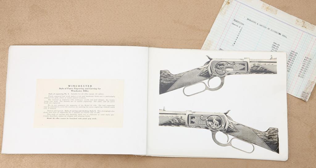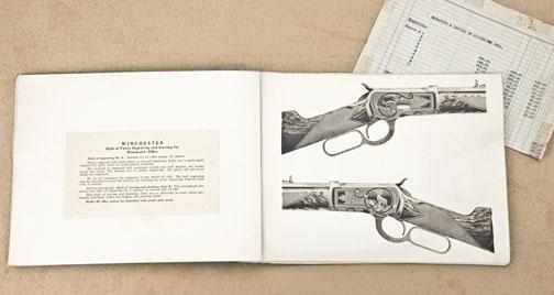 Original early Winchester dealer’s thirteen page handbook of Fancy Engraving and Carving Styles for Winchester rifles including a price sheet in overall good condition. Each page has a write-up on the back identifyingstyles of engraving from No. 1 thru No. 10 for rifles and style of engraving No. 1a for repeating shotguns and a sheet showing styles of carving and checkering for stocks and forearms from style A thru H. ThisWinchester collectible originally came from the Charles T. Haven estate, noted gun author and collector. Est.: $300-$600.
