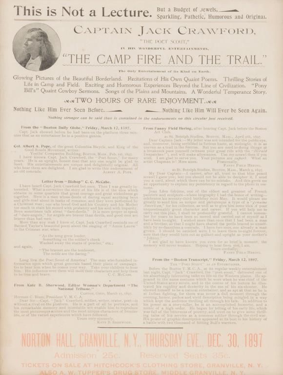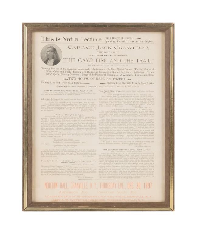 Original framed Captain Jack Crawford advertiser, approx. 13” x 10-1/2” announcing Jack’s appearance at the Norton Hall, Granville, NY on Dec. 30, 1897 to provide “Two Hours of Rare Enjoyment” with “thrilling Stories of Life in Camp and Field”plus “Recitations of His Own Quaint Poems”; all for the princely sum of .25 cents admission (.35 cents for reserved seats). The advertiser is in overall very good condition with a classic picture of the Captain in the upper left hand corner ofthe flyer. Est.: $500-$1,000.