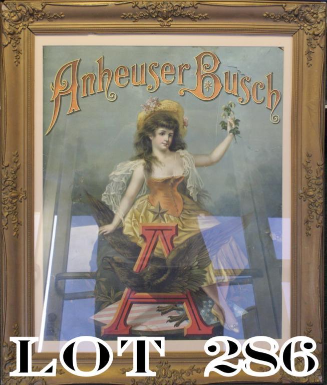 Original framed and matted Anheuser Busch advertiser approx. 32” x 27” (frame size) showing a young lady over a large red “A” and eagle in overall fair+ condition with nice detail and coloring but a number of scattered tears and some scattered losses; the frame is overall good with gold finish and heavy patina with some decorative losses. This early piece would be greatly improved with some careful conservation and cleaning.Est.: $450-$900.