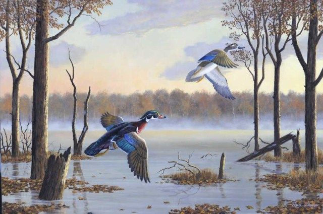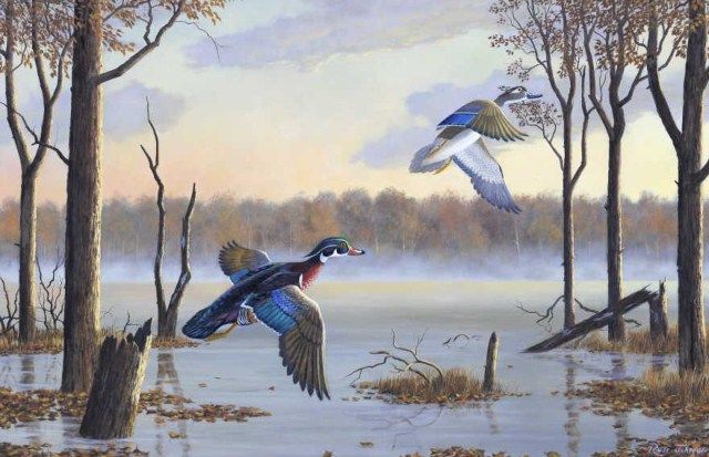 Original gouache on board entitled “Morning” signed lower right by Russ Johnson. From Robert E. Petersen water fowl art collection. Size is 24” x 36” needs slight cleaning and there are a few minor spot and marks, noframe. Est. $1,000-$2,000